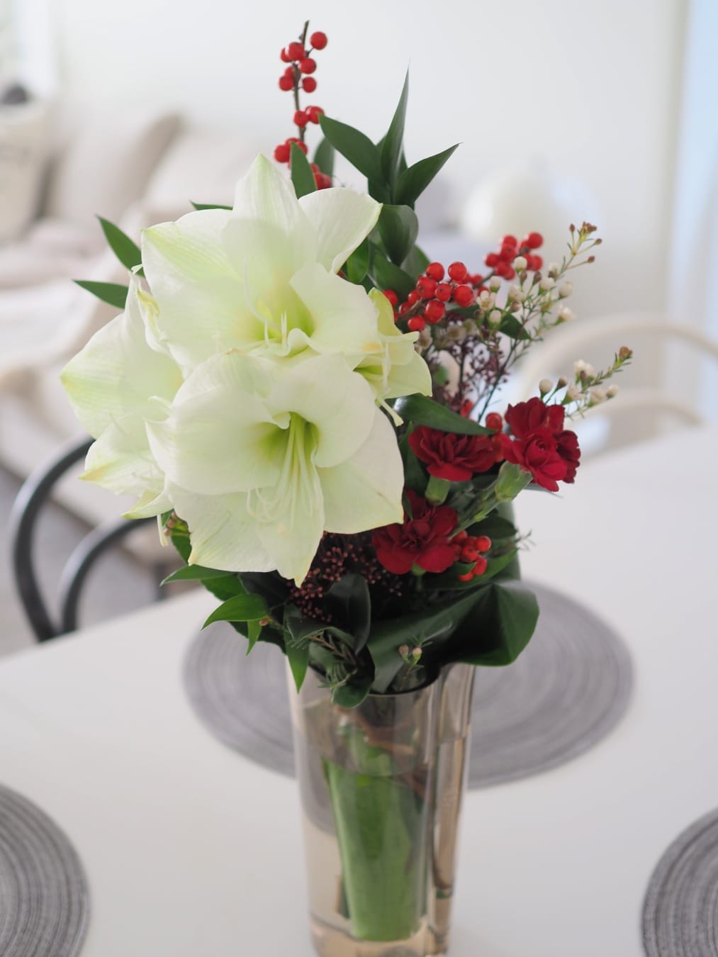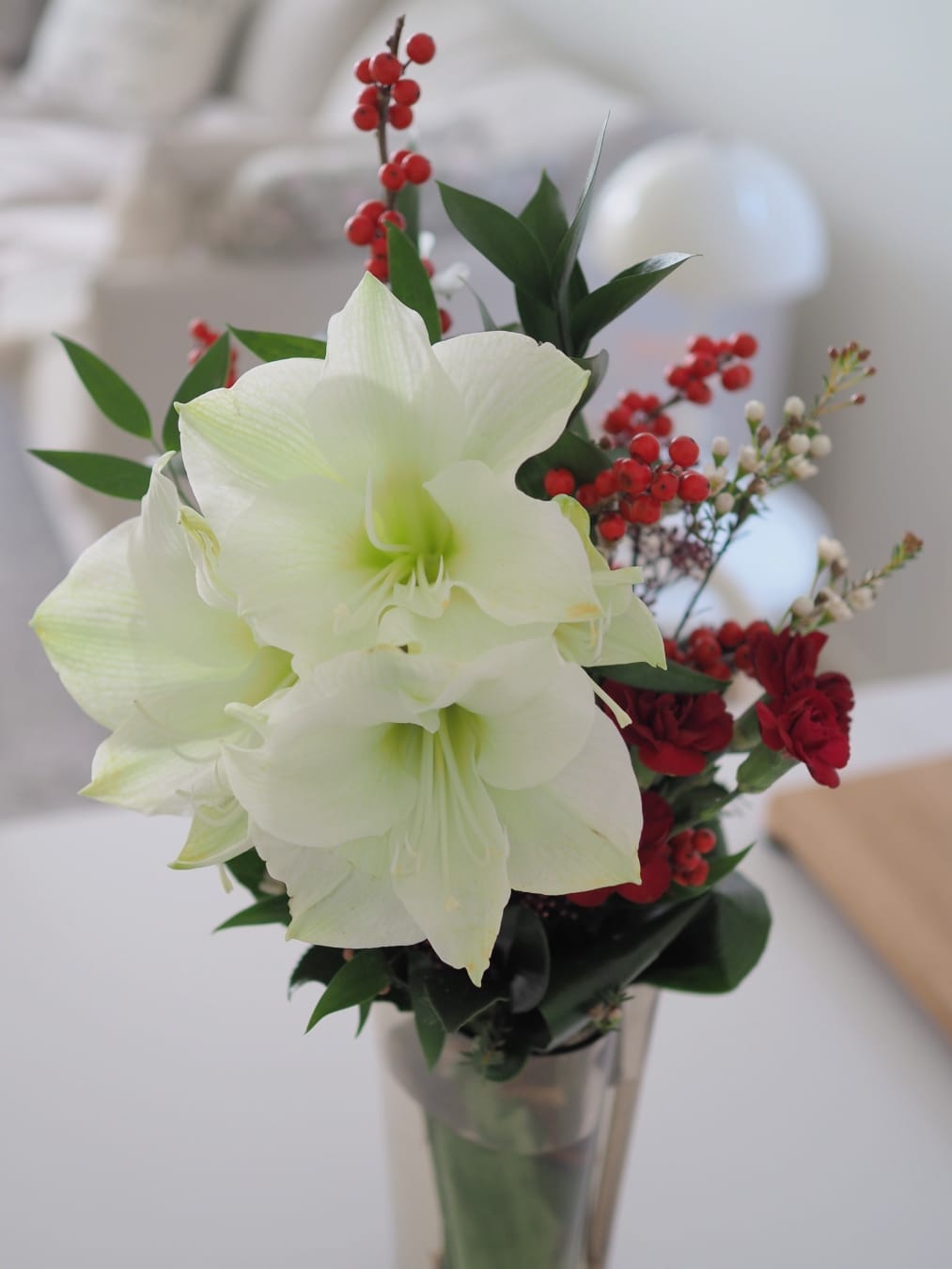 Ostan ruukkuamarylliksen yleensä hyvissä ajoin ennen joulua, jotta kukka ehtii varmasti avautua jouluaattoon mennessä. Tänä vuonna unohdin, mutta mies yllätti minut upealla leikkoamarylliksellä.
