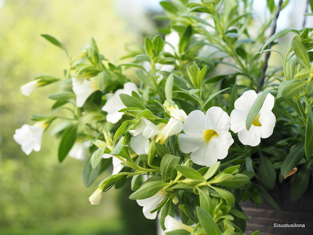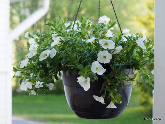 Etuoven pieleen ostin tänä kesänä amppelikasviksi valoa ja lämpöä rakastavan petunian. Petuniat tarvitsevat vähintään 5–6 tuntia auringonvaloa päivässä, joten toivotaan, että paistetta riittää. Tällä hetkellä ainakin vaikuttaa hyvältä, kun varjossakin on +25 astetta, vaikka on vasta toukokuu. Pikkuisen jännittää, kuinka petunia selviää hoidossani. Se kun tarvitsee tasaista kastelua, enkä itse ole niitä kaikkein jämpteimpiä kastelijoita.
