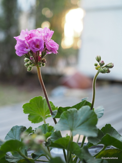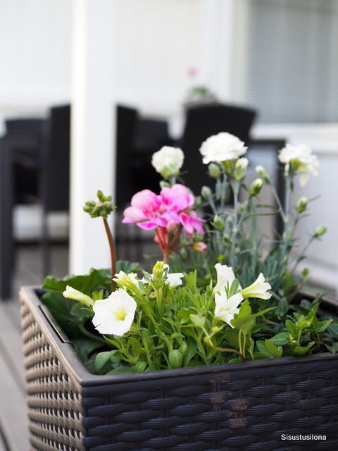 Pelargoniaa pidin pitkään mummokukkana mutta nykyään tykkään tästä klassisen kauniista kukasta kovasti. Värivalikoima on herkullinen, ja pelargonit ovat neilikan ohella kestävimpiä kukkia, joita voi istuttaa pihalle. Tuntuu, että pelargonia kukkii koko kesän säästä riippumatta. Parhaiten se toki viihtyy aurinkoisella ja valoisalla paikalla. Ripottelin valkoisia ja vaaleanpunaisia pelargonioita tänä vuonna myös yksittäisiin ruukkuihin terassille.