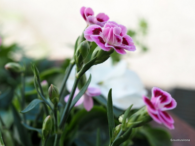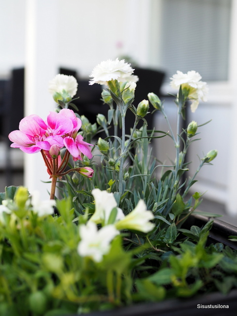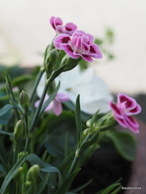 ”Löysin” neilikan viime kesänä. Se osoittautui käsittämättömän kestäväksi ja pitkään kukkivaksi kesäkukaksi, joka sinnitteli kukkivana terassillamme vielä ensilumen aikaan. Neilikka sietää paahdetta ja pientä kylmyyttä ja kukkii alkukesästä pitkälle syksyyn. Tykkään kerrannaisesta kukasta muutenkin, joten valkoiset neilikat pääsivät terassille ruukkuistutukseen vaaleanpunaisen pelargonian ja muratin kanssa.