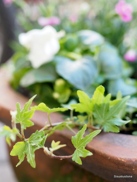 Muratti sopii valuvana, aina vihreänä kasvina ihanasti kesäkukkaistutuksiin muiden korkeampien kasvien seuraan. Siitä onkin tullut yksi luottokasveistani, jota minulla on ruukuissa lähes aina. Se ei kuulemma viihdy suorassa paahteessa ja sitä pitäisi kastella säännöllisesti, mutta meillä muratit ovat pärjänneet hyvin kaikenlaisissa olosuhteissa, varjossa, paahteessa, tuulessa, kosteudessa ja kuivuudessa.