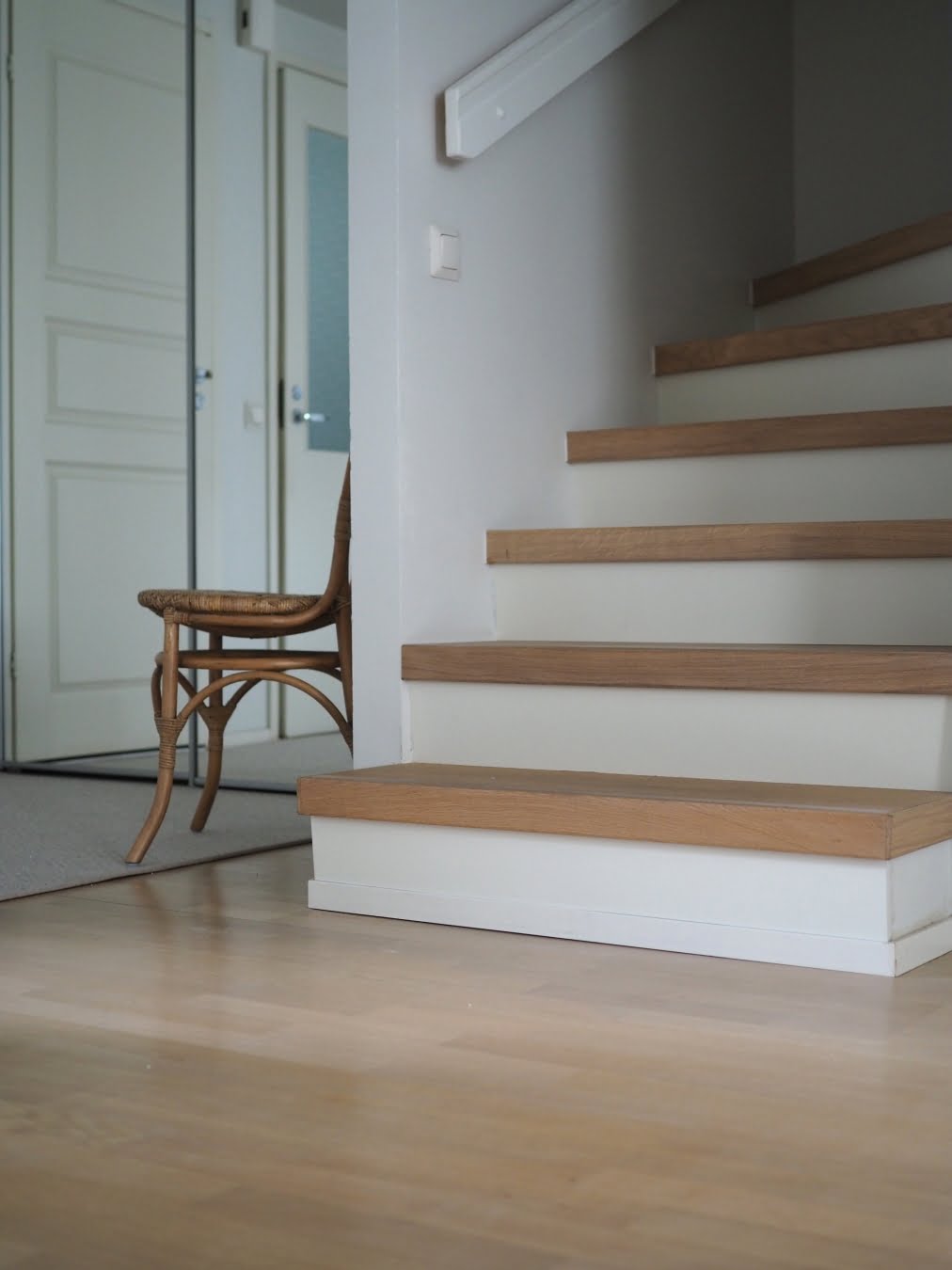Halusin yksinkertaisen kauniit, kestävät, valkolakatut tammiportaat, jotka sopivat muuhun sisustukseen. Muutos oli huikea! Portaikosta tuli remontin myötä raikas ja valoisa ja koko alakerta kaunistui silmissä. Puiset portaat luovat lämmintä ja kodikasta tunnelmaa ja ne jatkavat mukavasti parkettilattian linjaa.
