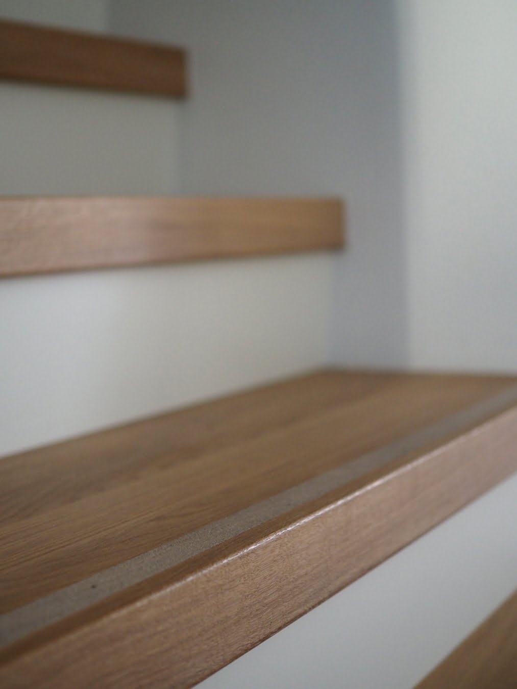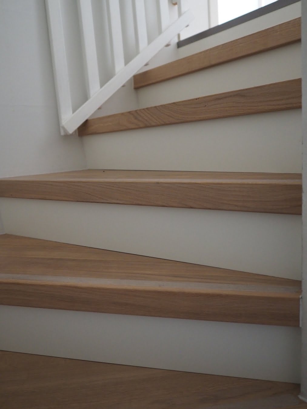 Asentaja työsti puuaskelmat kovasta tammimassiivipuusta, joka kestää hyvin kulutusta. Hän teki tarkkaa ja siistiä jälkeä, johon olemme olleet todella tyytyväisiä.