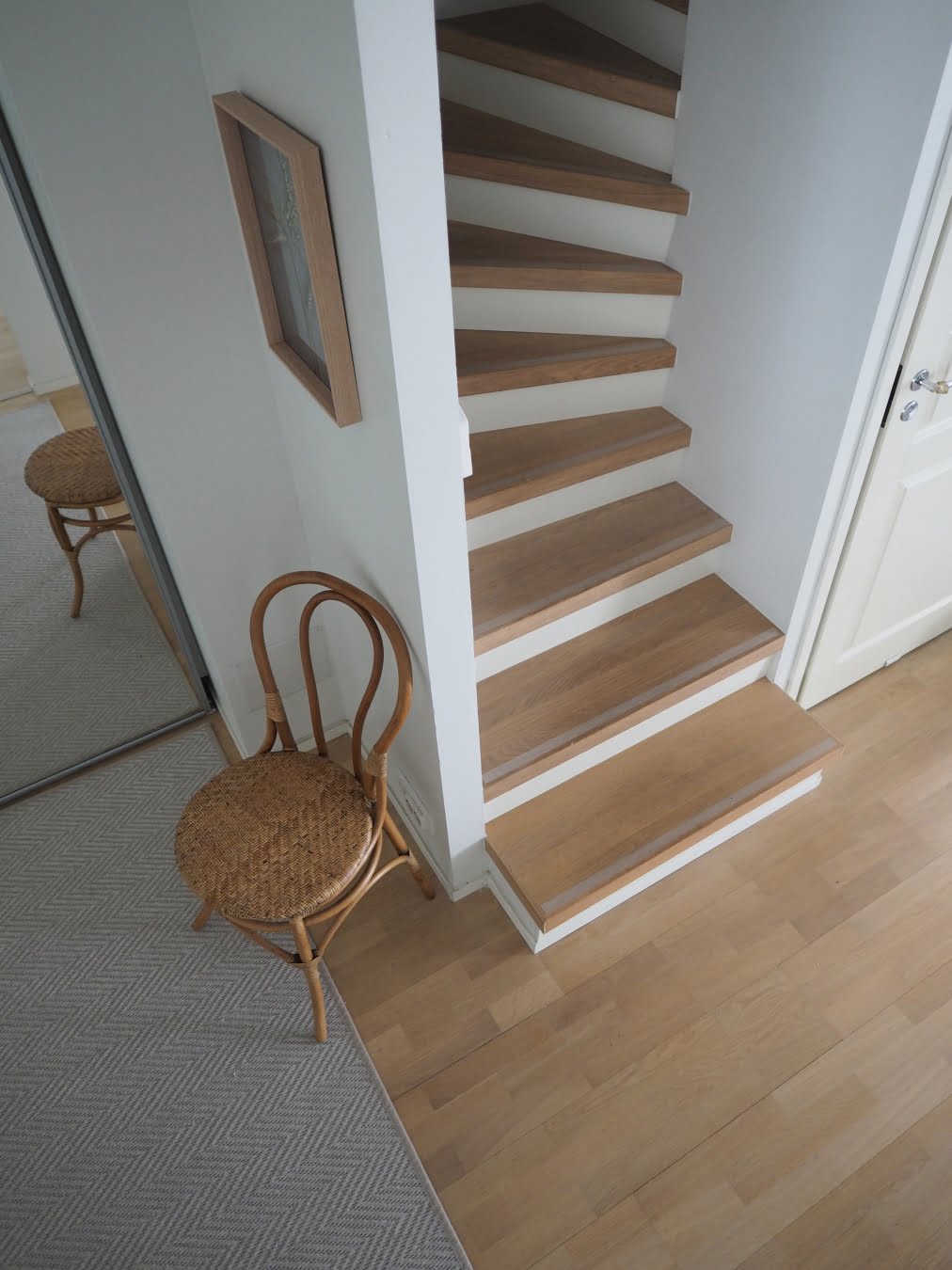 Silmä tottuu yleensä uudistuksiin nopeasti. Niin nytkin. Tuskin enää muistankaan, kuinka ankeat vanhat portaat olivat. Silti iloitsen uusista portaista joka ikinen päivä, kun kipitän niitä pitkin ylös ja alas. Rakastan puuta ja muita luonnonmateriaaleja, ja nämä portaat vain tuntuvat ja näyttävät hyviltä ja mieluisilta.