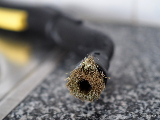 Kylppärin jälkeen eniten puhdistettavaa oli keittiössä. Kaakeleista ja etenkin kaakelisaumoista irtosi paljon likaa, vaikka olin mielestäni siivonnut niitä suht säännöllisesti. Pesurissa on useita harjaksia ja suuttimia, ja vaihtelin niitä siivottavan kohteen mukaan. Kaakeleiden välit putsasin messinkiharjaksilla.