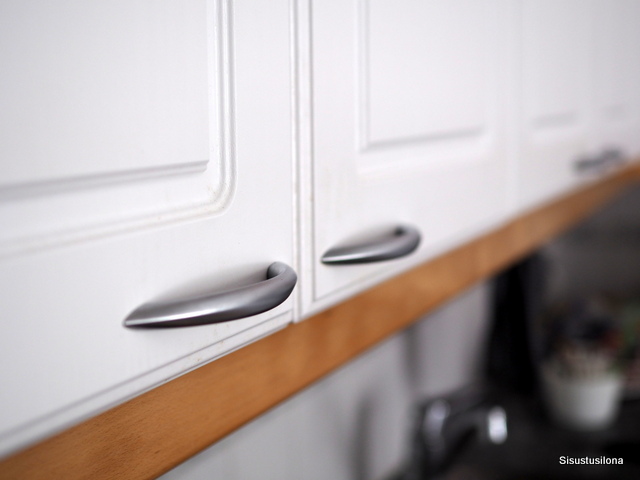 Keittiön kaappien ovet, lavuaarin ja hanan, roskiskaapin sisäpinnat ja kivitason puhdistin suuttimen päälle vedettävällä puuvillaliinalla. Kivaa ja helppoa!