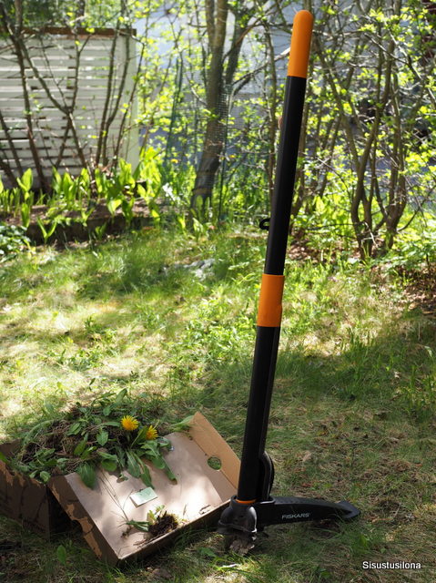 Tänä kesänä ryhdyin välineurheilijaksi ja napsin kaikki voikukat heti alkukesästä rikkaruohonpoistajalla. En ollut koskaan kuullutkaan moisesta vempaimesta ennen kuin kerran puutarhamyymälässä joku asiakas kyseli myyjältä ”voikukkapihtejä”. Heureka! Silläkö ne lähtevät? Halusin heti kokeilla, ja satuin saamaan pihdit lainaksi ystävältäni.