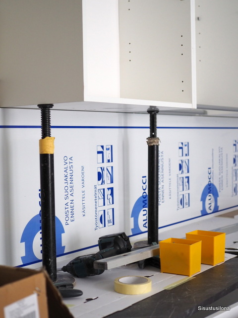Meidän keittiössämme ei kuulemma ole suuria vinouksia tai heittoja, joita olisi pitänyt korjata. Mitä suorempia keittiön lattia ja seinät ovat, sitä helpompaa asennus on. Tosin katto osoittautui hieman vinoksi, joten yläsokkelin kanssa piti pikkuisen hienosäätää.