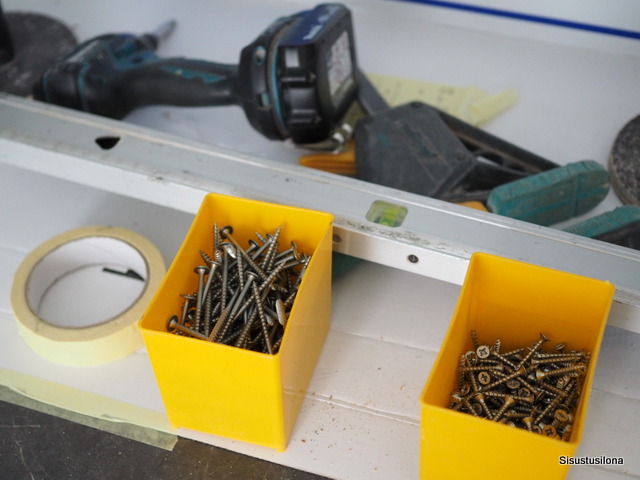 Vaikka kalusteet toimitettiin meille runkokasattuina, ylä- ja alasokkelit ja välitilalevyt piti sahata oikeaan mittaan, tasoon tehdä aukotukset ja muutenkin tehdä monenlaista askartelua ja säätöä.