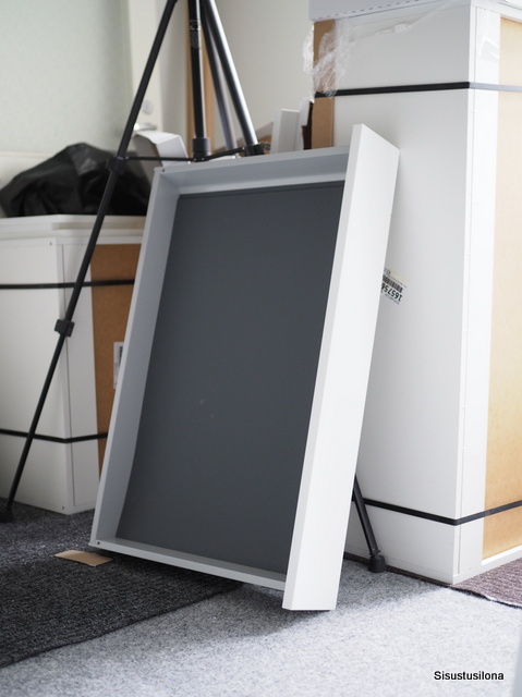 Asentaja huomasi myös, että osassa kaapinovista on naarmuja ja kolhuja, ja reklamoi niistä tehtaalle. Kolhuja taisi olla ainakin viidessä ovessa, mitä vähän hämmästelin. Nastolan tehtaalla oli laadunvalvonta näköjään pettänyt, ellei sitten kuljetuksessa ollut sattunut vahinkoa. Mutta pääasia on, että asia saadaan korjattua.