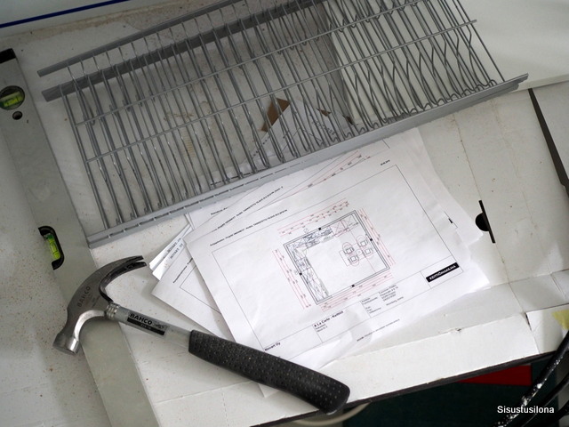 Hommaa vaikutti olevan niin, että heikkopäistä hirvitti, siis minua. Asentaja vilkuili tiuhaan keittiösuunnitelmaa, joka näytti olevan koko ajan esillä. Mittapiirroksista näkyvät keittiökokoonpanon mitat ja se, miten kaapistot sijoittuvat huoneeseen.