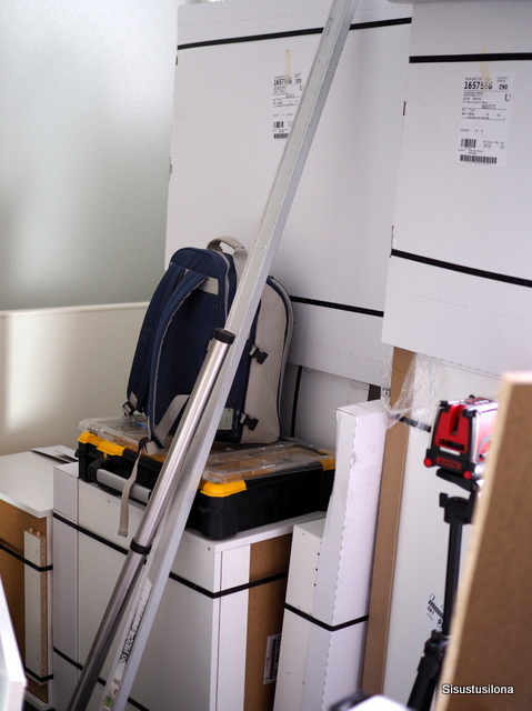 Mutta ei se ihan niin joutuisasti mennyt. Tavaraa tuli melkoinen kuorma ja koko keittiö täyttyi laatikoista, levyistä ja rullista, joiden sisältöä saatoin vain arvailla – vaikka olin tilausvahvistuksen omin silmin nähnyt ja hyväksynyt. Onneksi kalusteasentaja tarkisti lähetyksen: että pikkusälää myöten kaikki, mitä tarvitaan ja on tilattu, myös saapui perille.