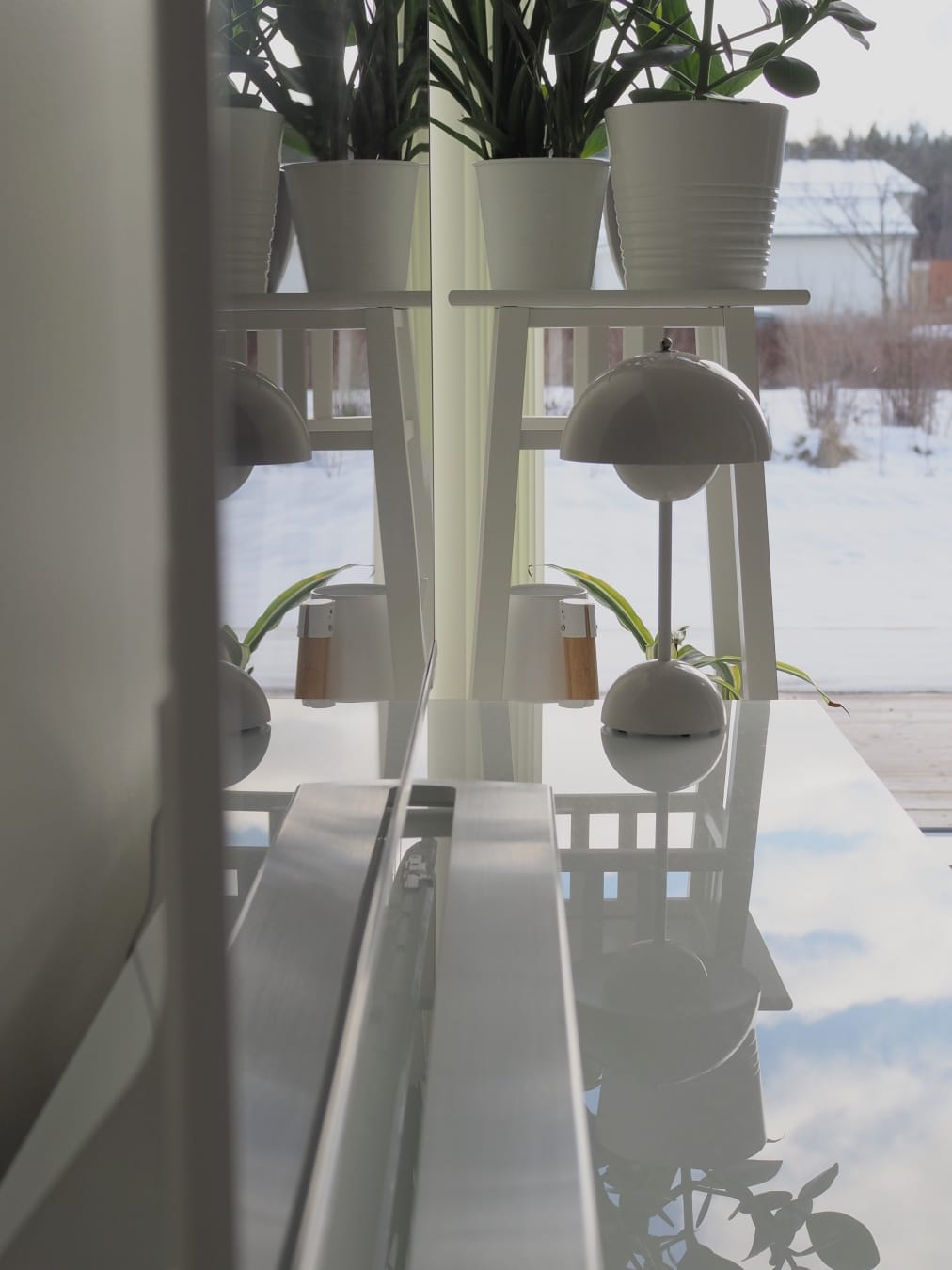 Myös kiiltävät ja vaaleat pinnat sekä lasiset tai metalliset yksityiskohdat heijastavat valoa tehokkaasti. Omassa olohuoneessamme on tv-tason päällä lasikansi, joka suojaa tasoa naarmuuntumiselta. Se heijastelee ihanasti ikkunasta tulvivaa luonnonvaloa.