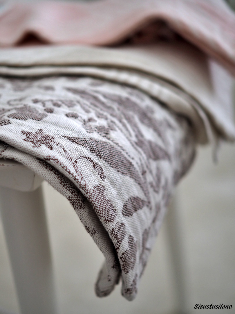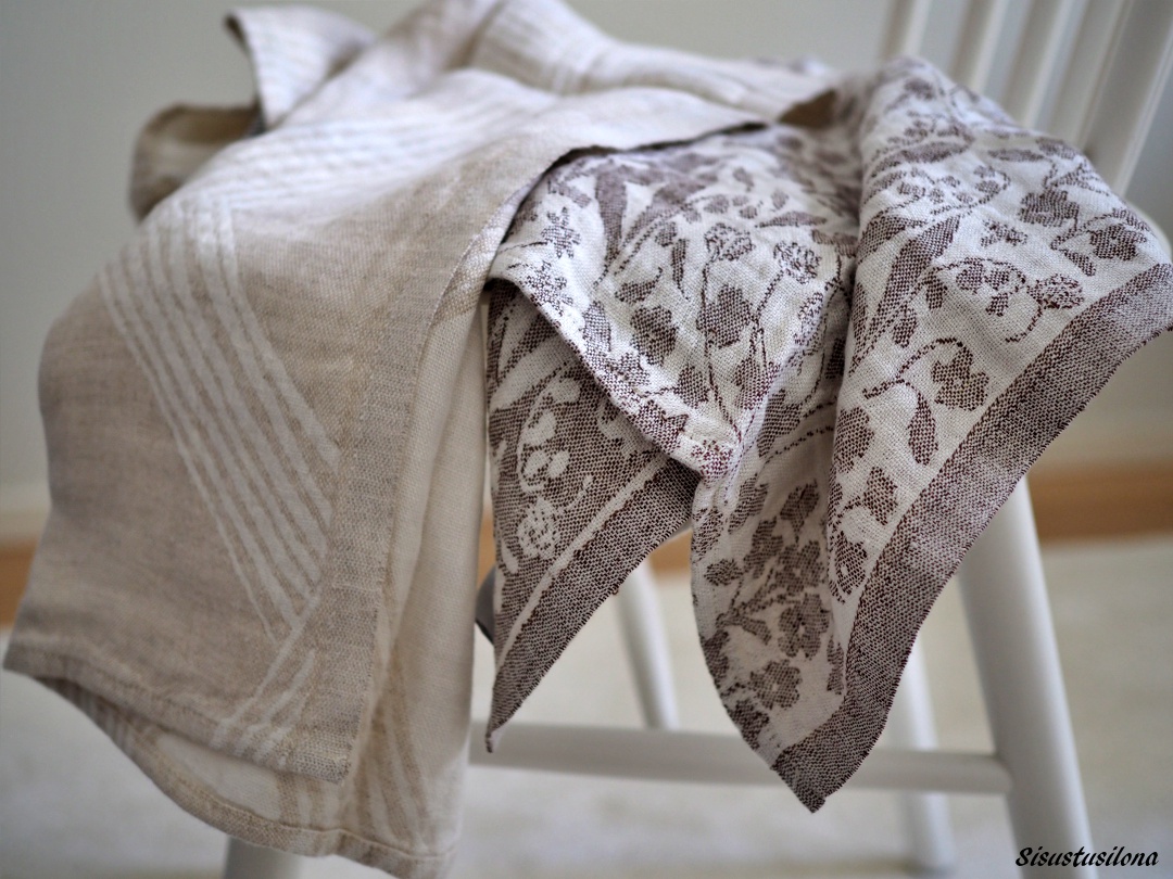 Himmeli- ja Niitty-pyyhkeet ovat todella kauniita, luonnossa vielä kauniimpia kuin kuvissa. Voisin häpeilemättä pitää niitä vaikka olohuoneessa. Nämä ravistelevat viimeistään pois vanhan mielikuvan: pellavapyyhkeet ovat kaikkea muuta kuin ankeita.