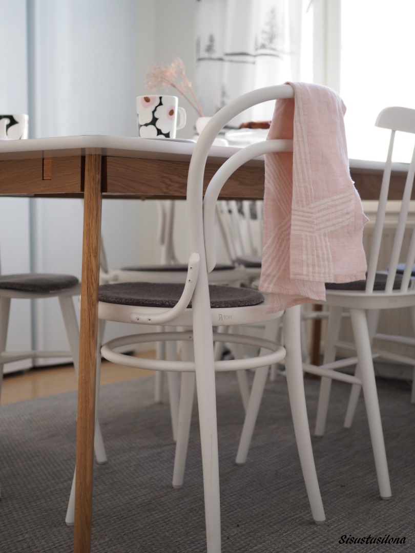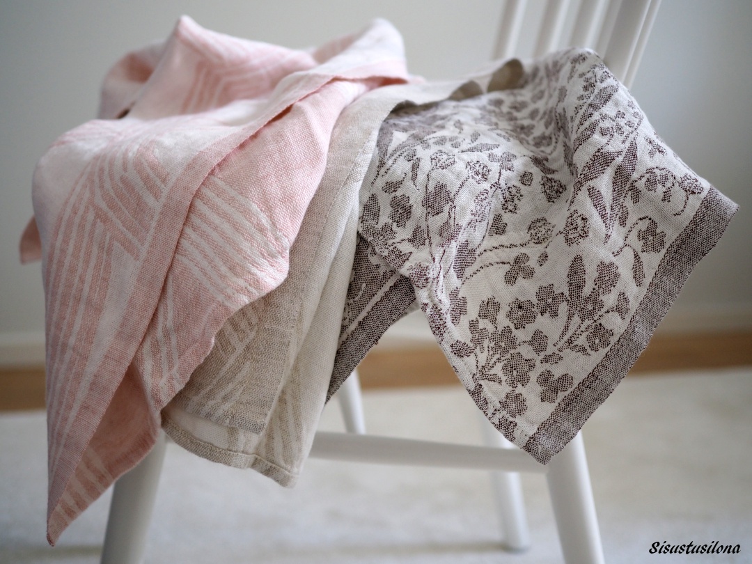 Siksi ilahduin valtavasti, kun sain blogin kautta Lapuan Kankureilta kolme pellavaista uutuuspyyhettä, kaksi Himmeli-pyyhettä ja yhden Niitty-pyyhkeen. Värit sain itse valita, joten valitsin keväiseen keittiöön hempeän valko-roosan, harmonisen valko-pellavan ja luonnollisenkauniin valko-ruskean.