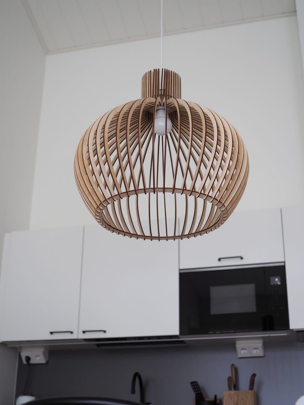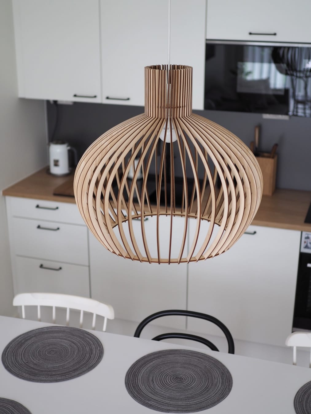 Mutta lopulta puinen valaisin voitti, joten sellaisen ostin. Olen tyytyväinen, että sain vihdoin hommattua ja asennettua ruokapöydän valaisimen, aivan ihanan sellaisen. Valaisimen on valmistanut käsityönä pienehkö latvialainen perheyritys, jonka valikoimissa on useita samantyyppisiä, muodoltaan erilaisia puuvalaisimia. Ostin heiltä toisenkin, sipulia muistuttavan valaisimen makuuhuoneeseen. Sekin tulee varmasti näkymään jossain vaiheessa täällä blogissani, tai ainakin Instagram-tililläni. Jos et vielä seuraa minua Instassa, otahan tilini seurantaan.
