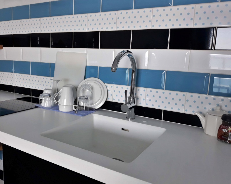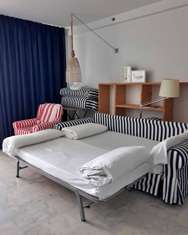 Asuimme tilavassa, moderniin merihenkiseen tyyliin sisustetussa huoneistossa, jonka koko oli huikeat 70 neliömetriä. Kaksiossamme oli iso makuuhuone ja vielä isompi olohuone, keittonurkkaus, siisti kylpyhuone ja iso parveke. Me aikuiset nukuimme makuuhuoneessa ja lapset olohuoneessa, jossa oli kaksi mukavaa lisävuodetta.