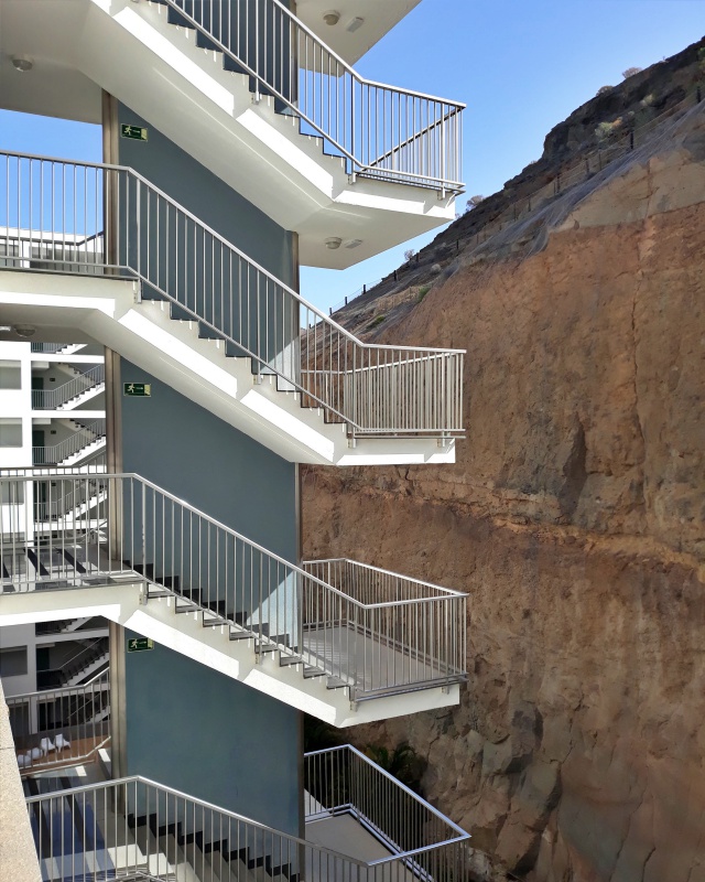 Kuinkahan monta kertaa päivässä kapusin portaita alas ja ylös? Hotellissamme oli hauskat ulkoportaat, joiden toisella puolella oli uljas kallio. Itse asiassa koko rappukäytävä oli avointa ulkotilaa, joten siellä liikkuessa sai nuuhkia raitista ilmaa. Olihan hotellissa toki hissikin, mutta sitä emme juuri käyttäneet.