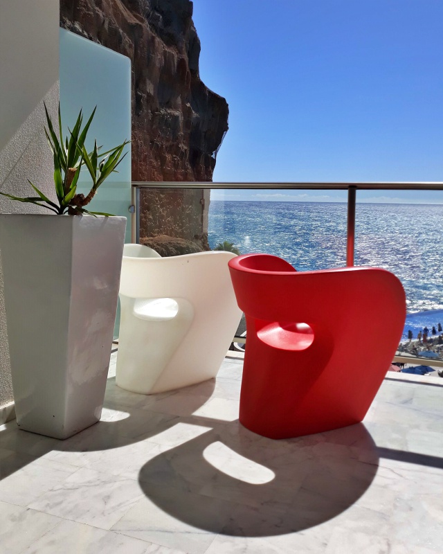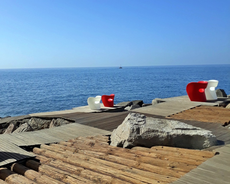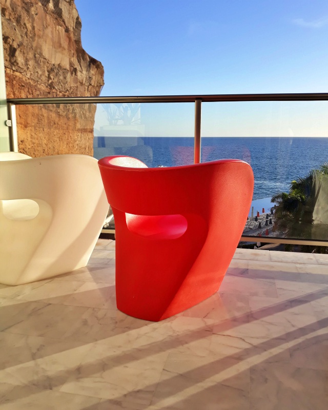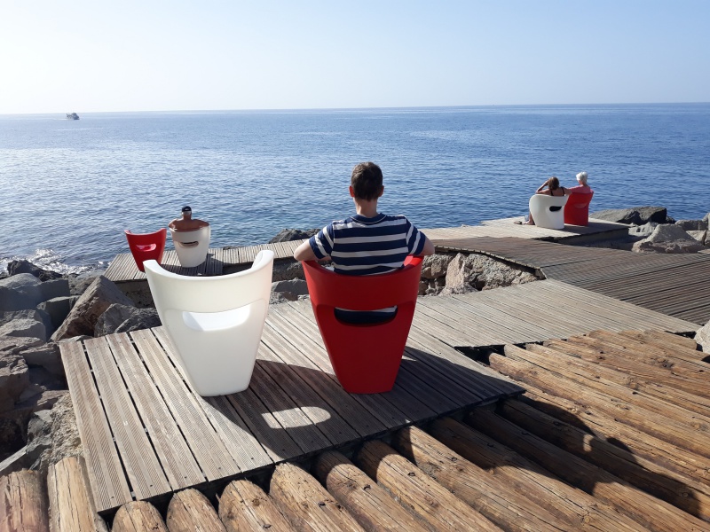 Allasalueen edustalla aivan meren ääressä oli rauhallinen, vain aikuisille tarkoitettu maisematasanne muutamine tuoleineen. Siellä oli mukavaa istuskella ja uppoutua omiin ajatuksiin. Kuvia siitä onkin jo vilahdellut tuolla edellä.