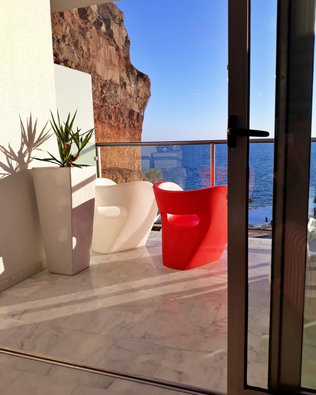 Kuudennen kerroksen parvekkeelta oli huikeat näköalat merelle, satamaan ja uima-altaalle. Ja kyllä me niistä nautimmekin. Aurinko paistoi parvekkeelle päivästä iltaan ja varsinkin ilta-auringossa maisema oli henkeä salpaavan kaunis.