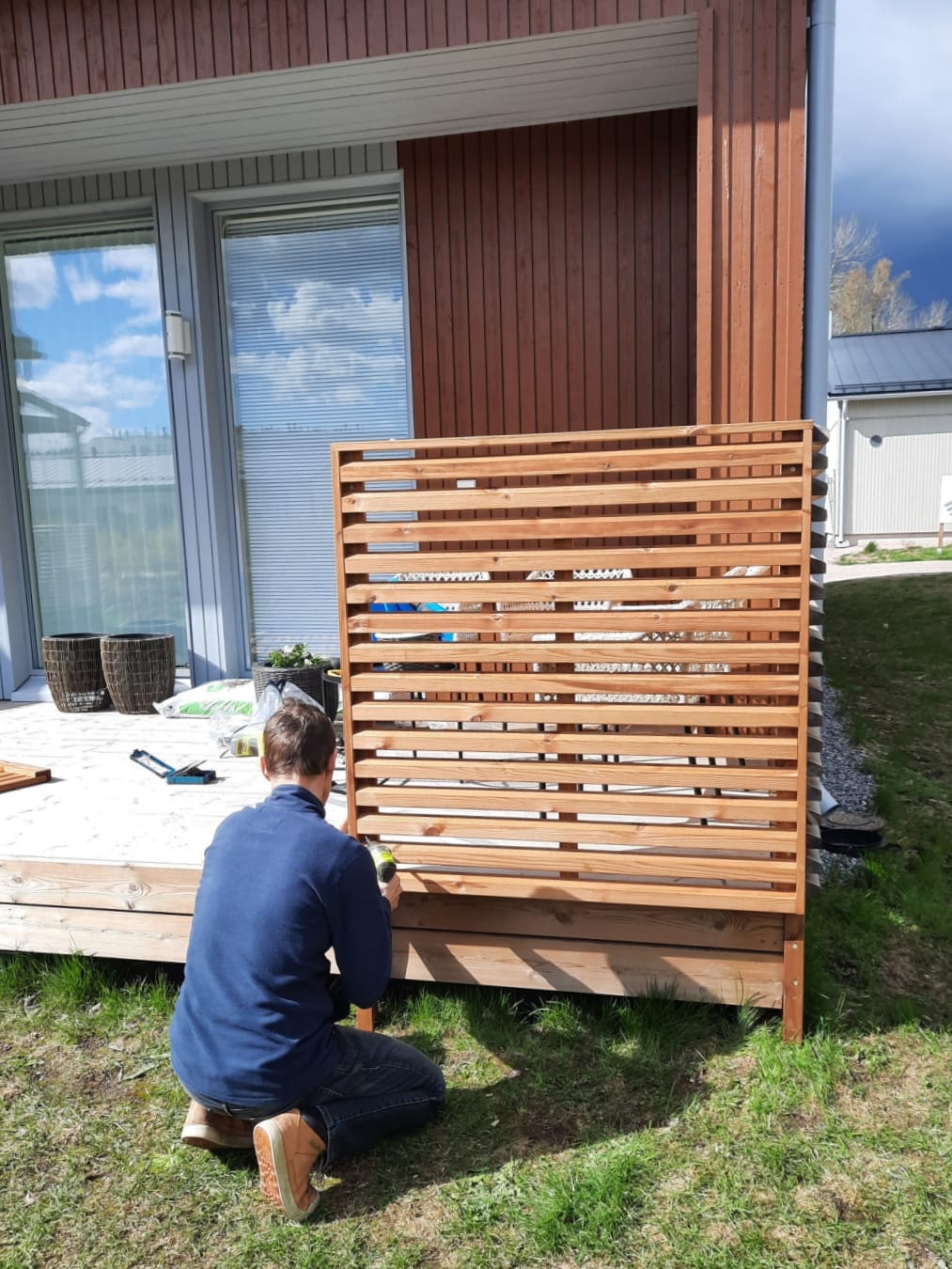 Ostin ensin kaksi aitaelementtiä ja asensin ne miehen kanssa terassin reunaan. Se toimi heti. Sain suojattua kulman, jossa istumme eniten. Mutta nopeasti tajusin, että näkösuoja jää vähän vajaaksi. Halusin jatkaa näkösuojaa vielä vähän, ja kiirehdin parin päivän päästä ostamaan kolmannen samanlaisen elementin.