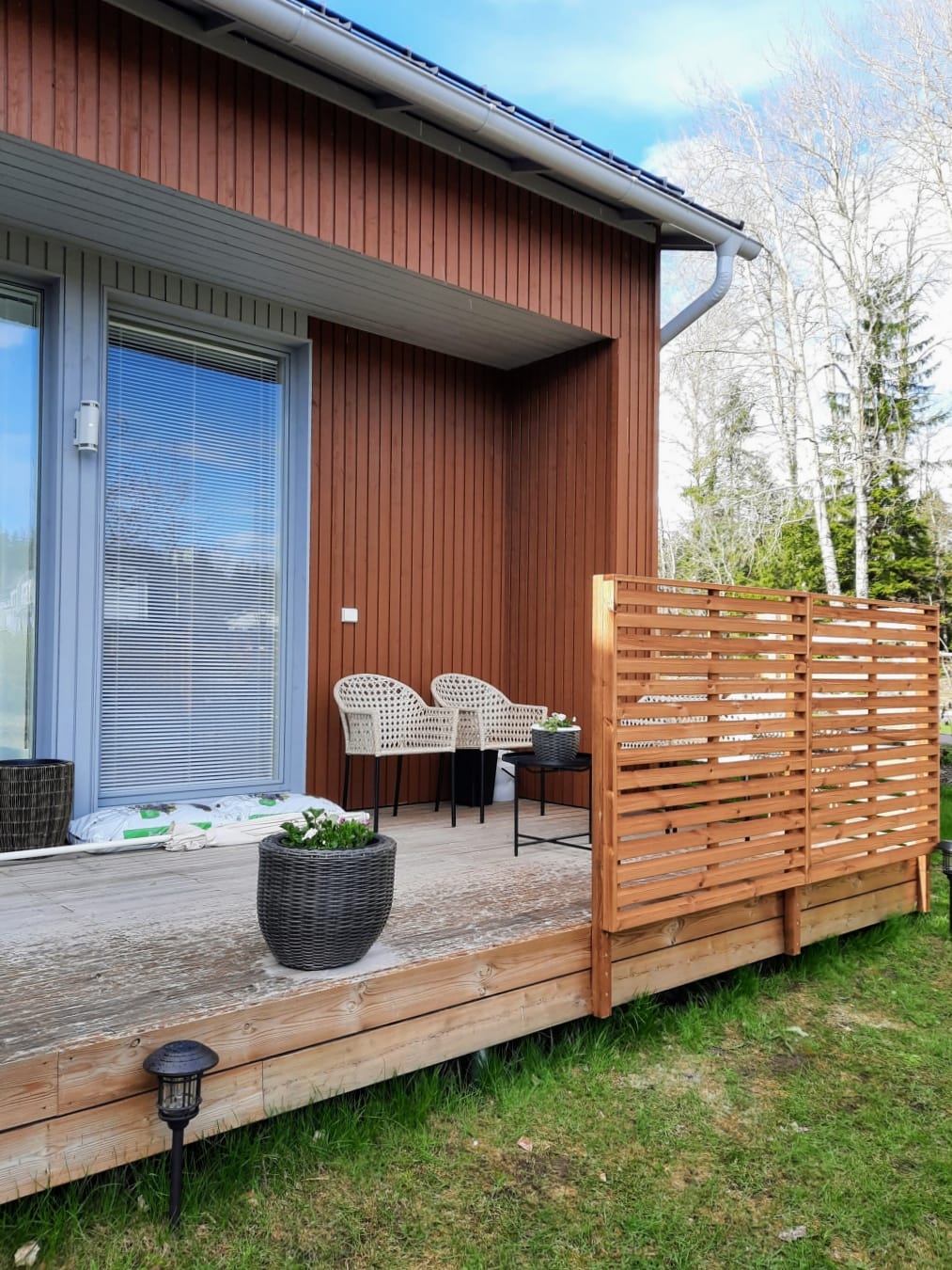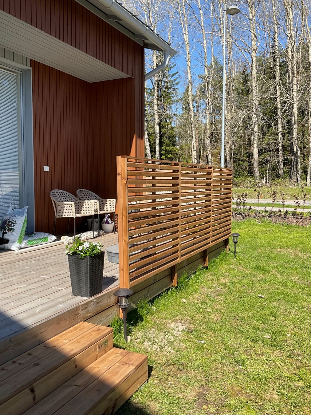 Tutkin vaihtoehtoja monta viikkoa. Suunnittelin ensin, että istutan terassin eteen istutusaltaisiin puolikorkeita havukasveja, esimerkiksi pikkupilarikatajia. Lopulta päädyin 120 x 120 cm kokoiseen Tammiston Puun Saari -aitaelementtiin, jota myy ainakin K-Rauta. Aita on kestopuuta, ruskeaksi käsitelty ja ulkonäöltään yksinkertainen, mutta ryhdikäs. Se ei tuki näkymää kokonaan, mutta rajaa tilaa ja tuo suojaa juuri sopivasti.