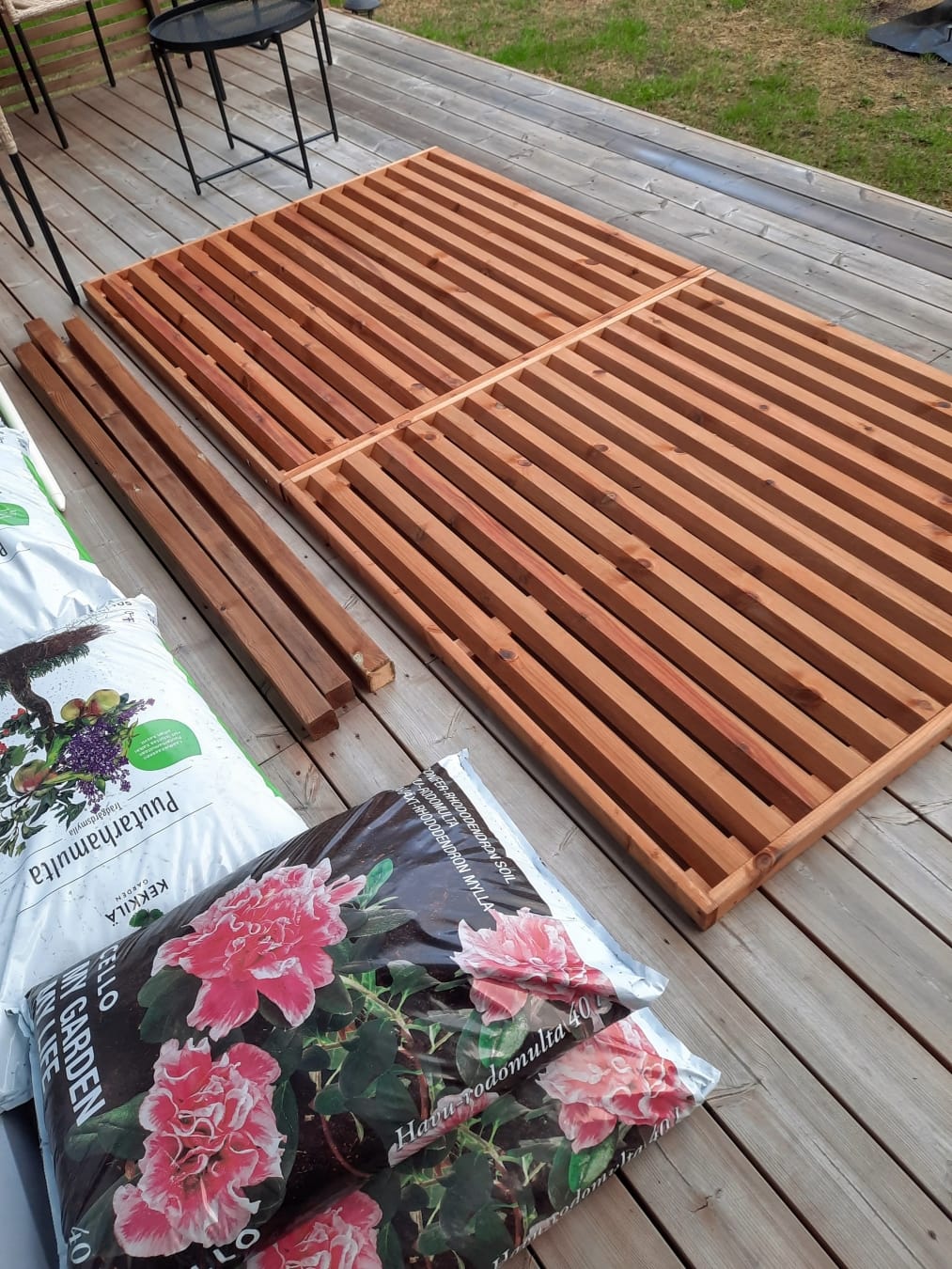 Seuraavaksi odottelen, että aitaelementit haalistuvat samanvärisiksi kuin terassin lattia nyt on. Se tapahtuu auringonvalossa aika nopeasti. Ensi kesänä voin sitten öljytä näkösuojan, kun puu on varmasti riittävän kuivaa. Terassin öljyäminen on ohjelmassani jo tänä kesänä, kunhan pahin siitepölykausi on ohi.
