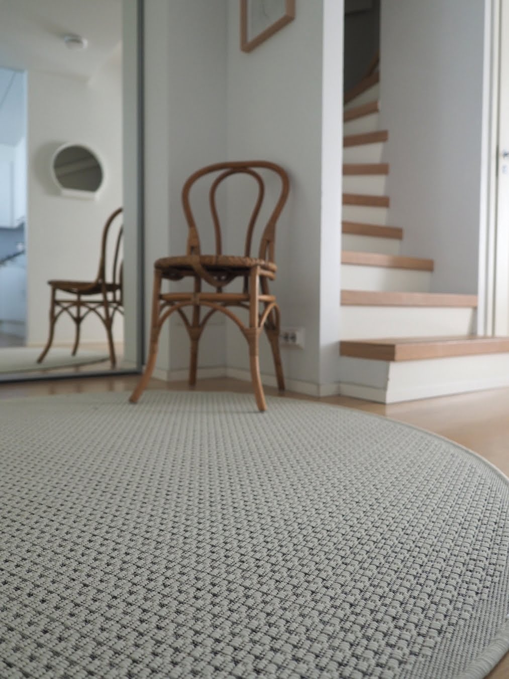 Muistatko, kun kerroin muutama viikko sitten ihastuneeni pyöreään villamattoon ja sen moniin hyviin ominaisuuksiin? Hyvästä kokemuksesta innostuneena päätin kokeilla pyöreää mattoa myös eteiseen. Ja arvaa mitä! Pyöreä matto istuu eteiseen kuin nenä päähän. Kulmikas, epäsymmetrinen tila tuntuu selkeämmältä, avarammalta ja pehmeämmältä.