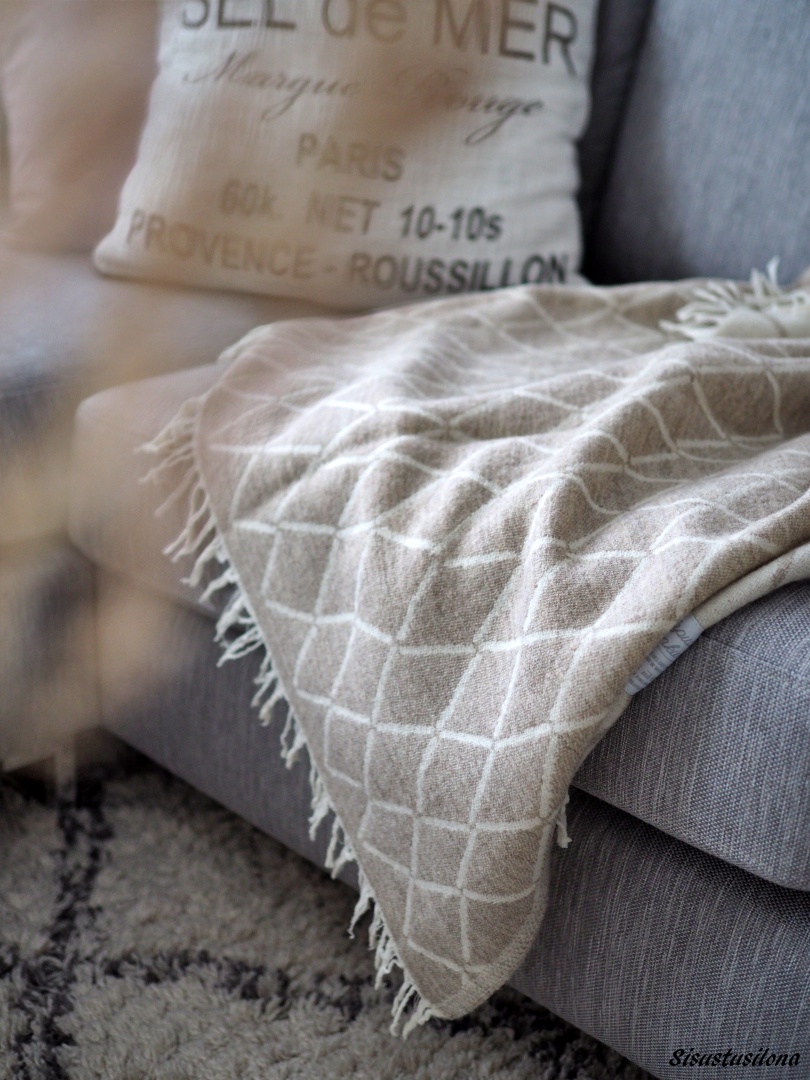 Olin aiemmin jotenkin jumittunut ajatuksissani harmaaseen ja harmaa-valkoiseen. Etsin vain tuon värisiä huopia ja suljin silmäni muilta väreiltä. Lopulta päästin irti päähänpinttymästäni ja tajusin, että huopa saakin olla beige: se on pehmeä, lämmin, lempeä ja luonnonläheinen väri, josta tykkään tosi paljon.