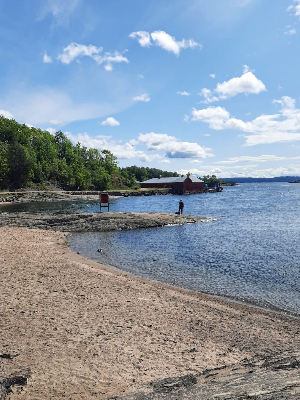 Vesi oli Oslonvuonossa yllättävän lämmintä ja uimarannat siistejä. Uimavesi on täällä keskikesällä yleensä muutaman asteen päälle 20 astetta. Mies tyytyi katselemaan kahdella ensimmäisellä uimakerralla, mutta kolmantena päivänä, saarireissullamme, hänkin sukelsi mereen.