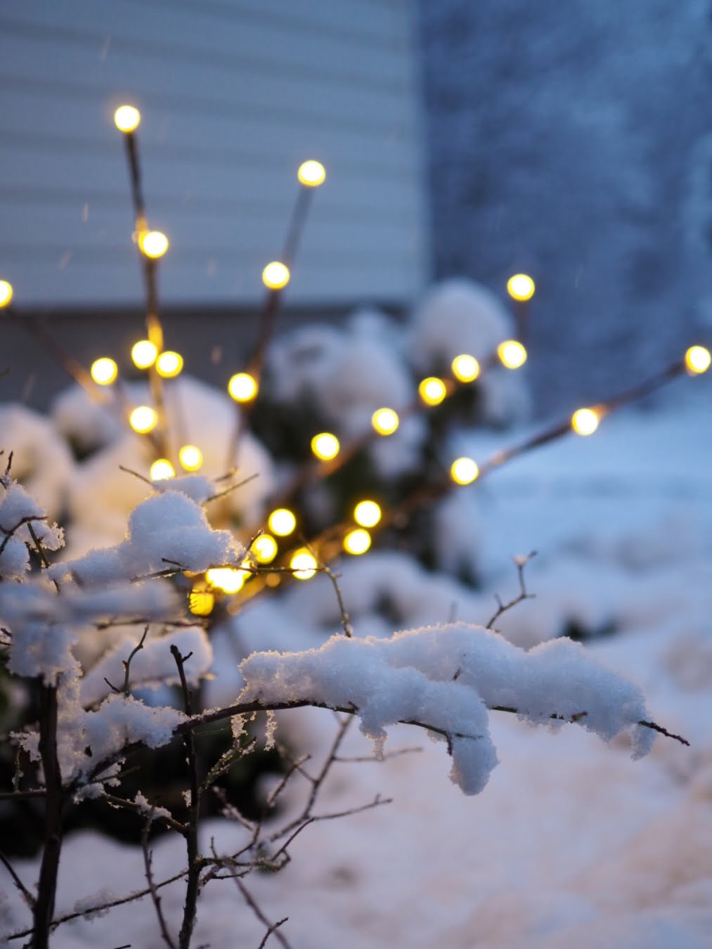 Virittelen jouluvalot paikoileen yleensä joulukuun alussa. Laitan kynttelikön ikkunalle, räystäsvalosarjan ulko-oven portaiden päälle, valopensaan kukkapenkkiin ja sydänvalosarjan rönsyilemään isoon lasivaasiin olohuoneeseen.