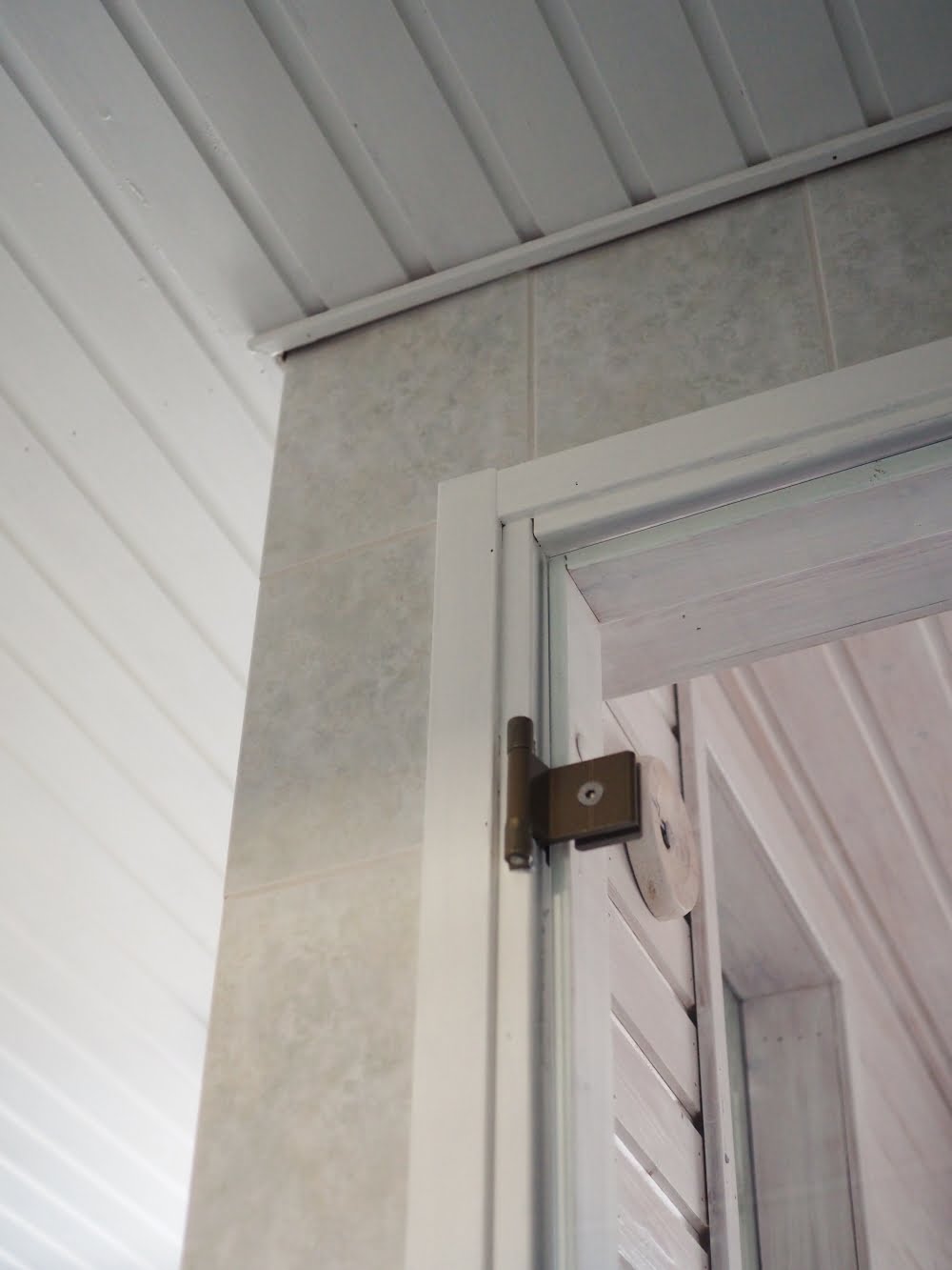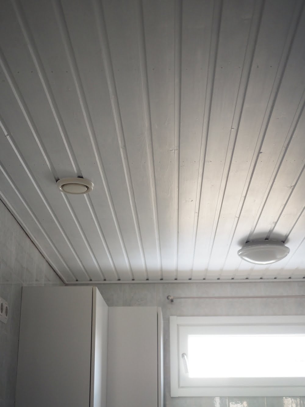 Haaveilen uudesta kylpyhuoneesta, mutta kylppäriremppaan liittyy niin paljon taloudellisia ja muita haasteita, ettei remontti ole juuri nyt mahdollinen. Jollakin tavalla 20 vuotta vanhaa kylpyhuonetta piti kuitenkin päivittää. Päädyin helppoon ja edulliseen keinoon: maalasin tummuneen ja tunkkaisen mäntykaton sekä mäntyiset ikkunan- ja ovenpuitteet valkoisiksi.