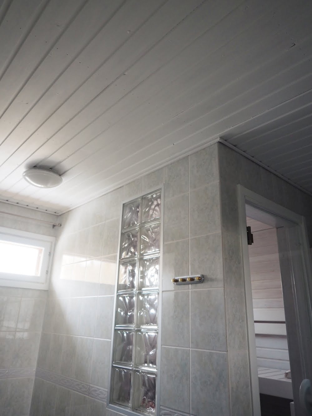 Kylpyhuone raikastuu silmissä, kun maalaat tummuneen ja tunkkaisen mäntykaton vaaleaksi. Maalilla on uskomattoman iso vaikutus. Itse maalasin katon lisäksi mäntyiset ikkunan- ja ovenpuitteet valkoisiksi.