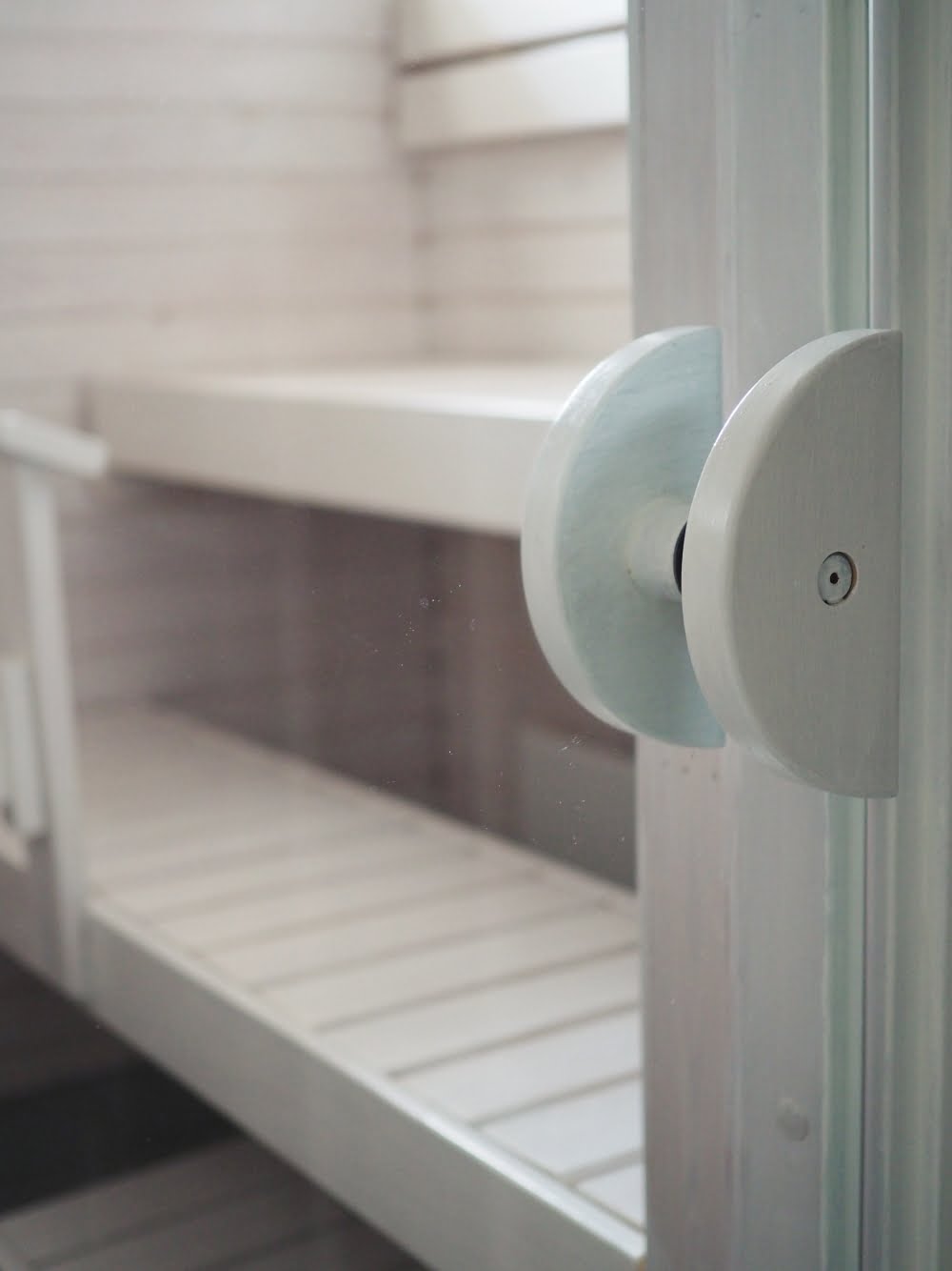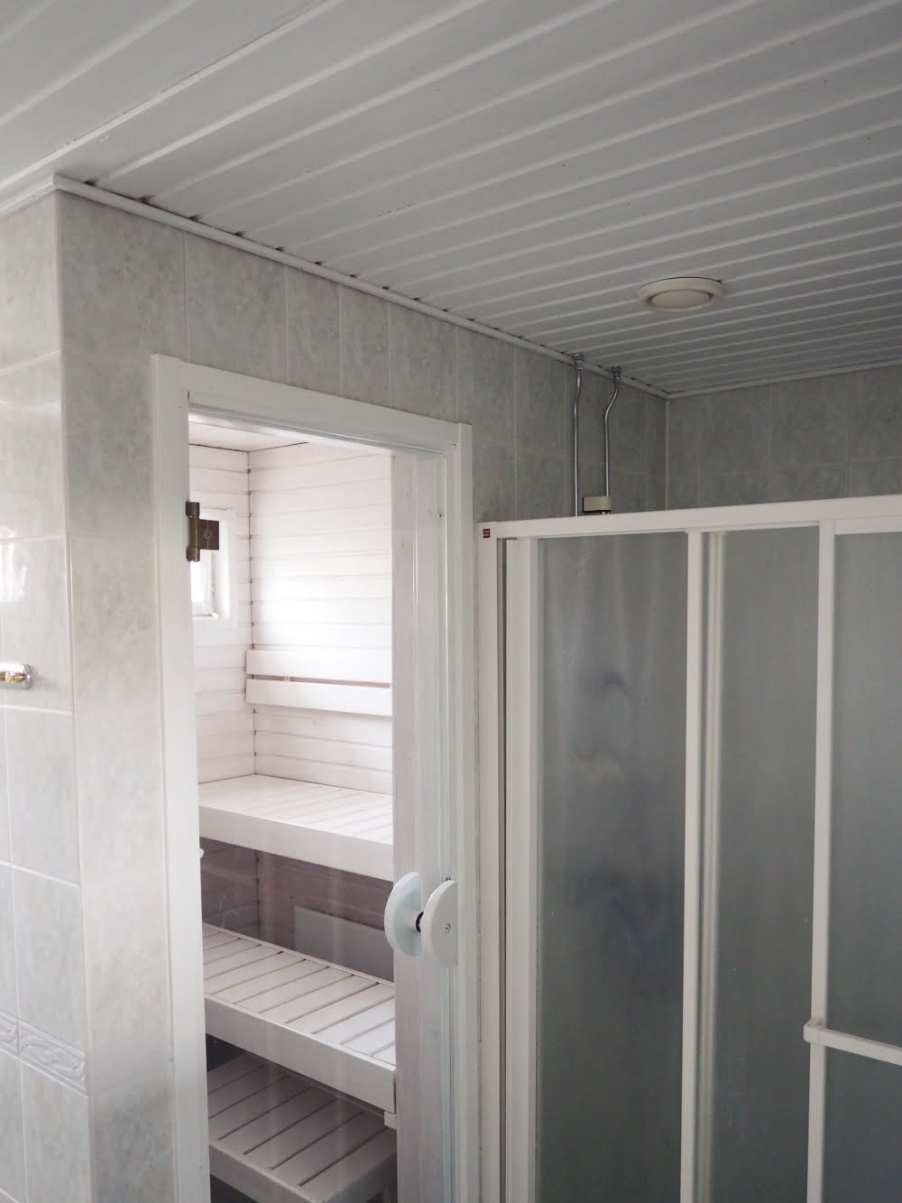 Niin, ja hommahan lähti sitten vyörymään lumipallona saunan puolelle. Mäntyinen sauna sopi hirveän huonosti uudistuneen, vaalean kylppärin kanssa yhteen, joten vahasin saunankin valkoiseksi.