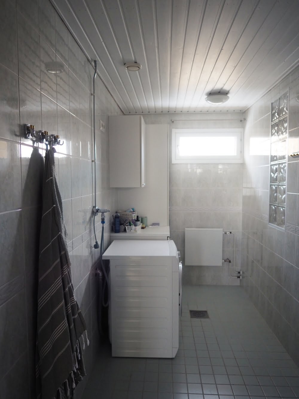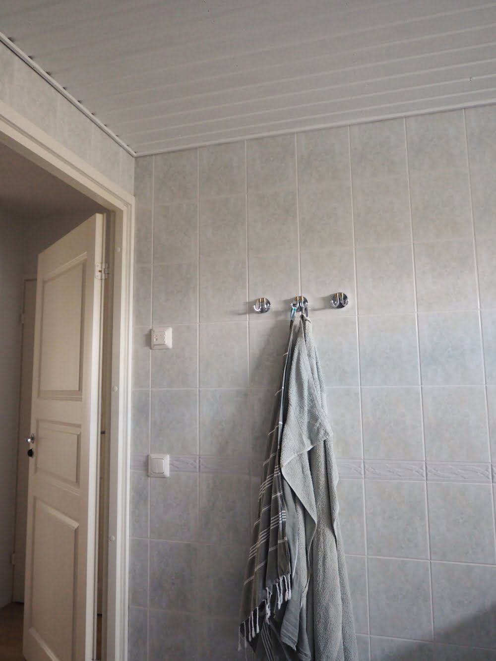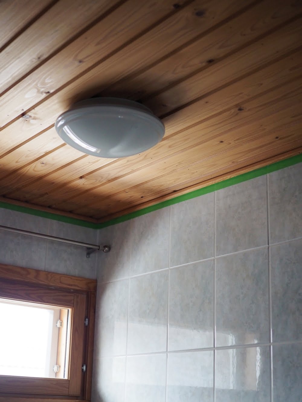 En ole koskaan oikein tykännyt kylppärin haaleanvihertävistä kaakeleista, mutta ne alkoivat näyttää vähän paremmilta, kun katto oli saanut valkoisen värin. Olisin toki voinut maalata seinä- ja lattiakaakelit kaakelimaalilla eri värisiksi, mutta se olisi ollut valtava urakka. Tiedän sen, koska maalasin vessan kaakelit aiemmin tänä vuonna.