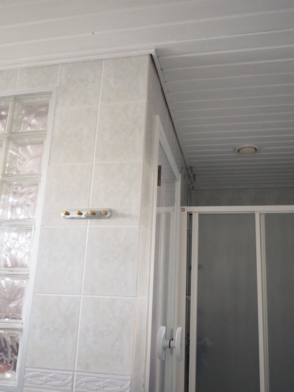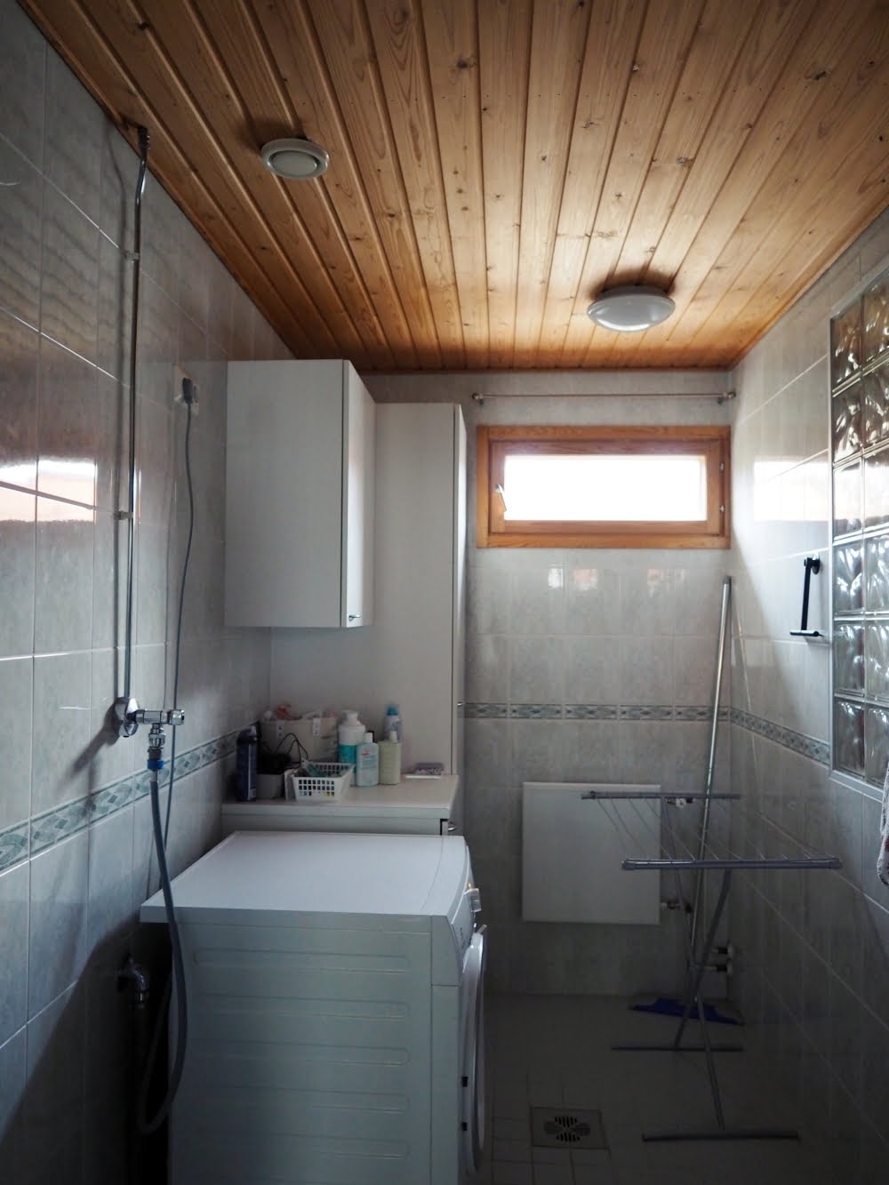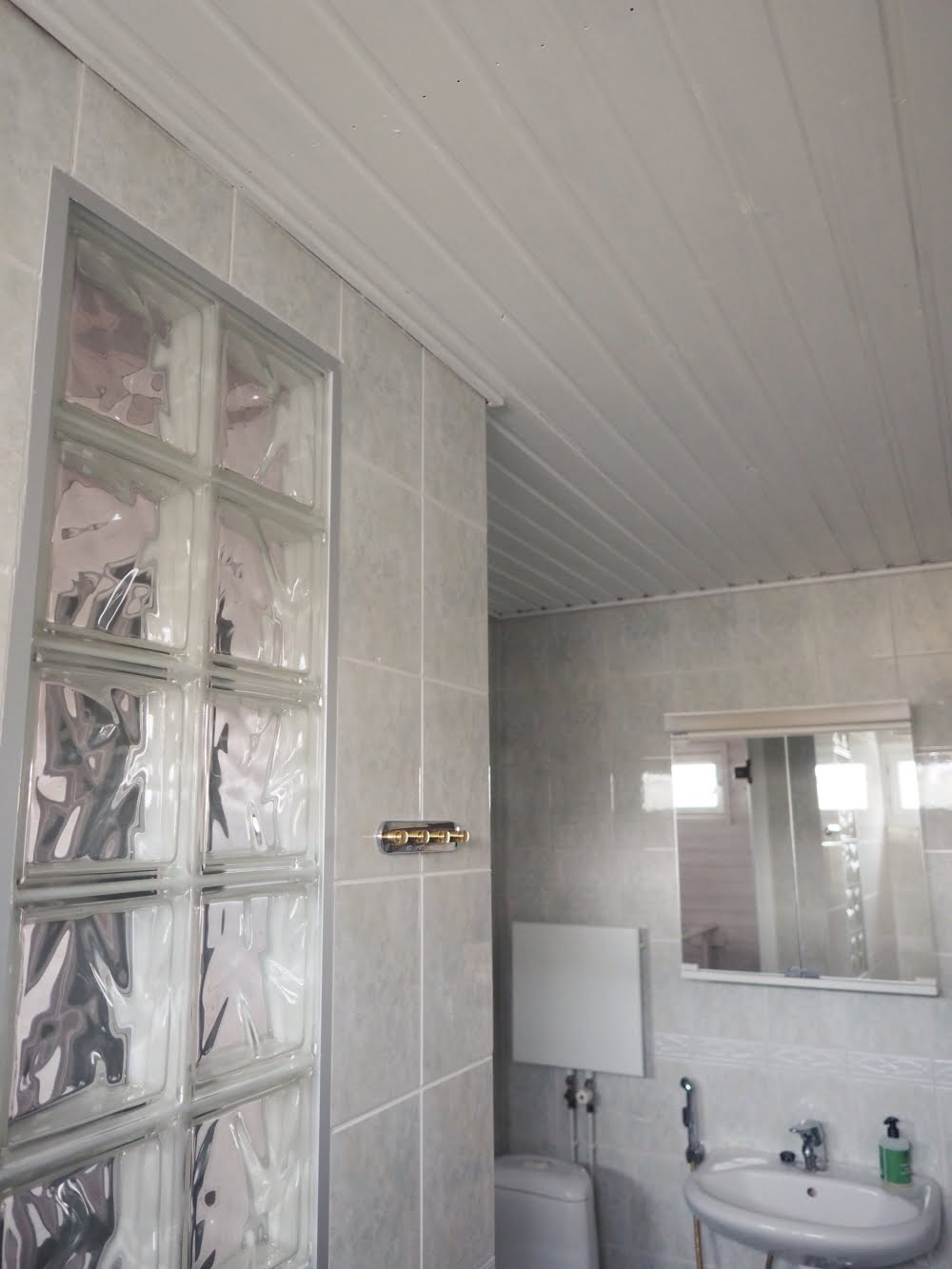 En ole koskaan oikein tykännyt kylppärin haaleanvihertävistä kaakeleista, mutta ne alkoivat näyttää vähän paremmilta, kun katto oli saanut valkoisen värin. Olisin toki voinut maalata seinä- ja lattiakaakelit kaakelimaalilla eri värisiksi, mutta se olisi ollut valtava urakka. Tiedän sen, koska maalasin vessan kaakelit aiemmin tänä vuonna.