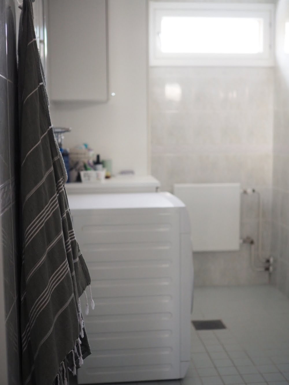 Mutta myrkynvihreän boordin halusin piiloon, joten maalasin sen vaaleanharmaalla kaakelimaalilla. Nyt kylppärin seiniä kiertävä boordi ei enää hypi silmille, vaan sulautuu yleisilmeeseen aika huomaamattomasti.