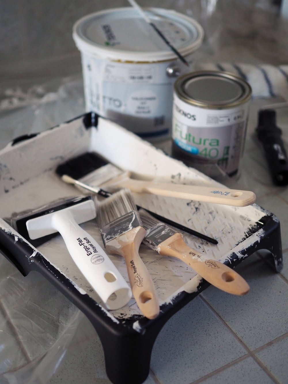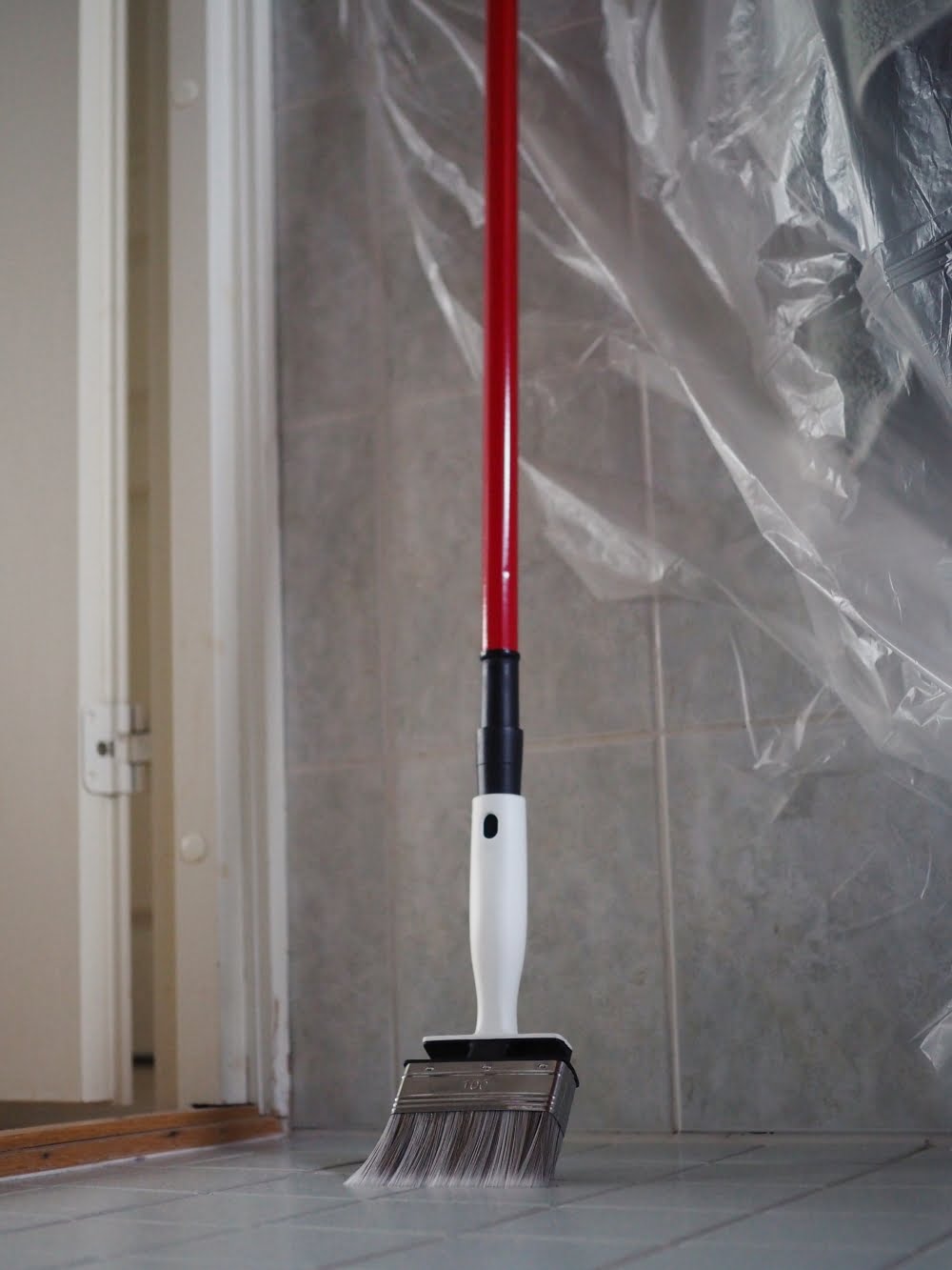 Aloitin suojaamalla seinät, tai oikeastaan osan seinistä. Suojaaminen hoitui helposti *Sokevan suojamuovilla, jonka yläreunassa on valmiina maalarinteippi. Tosi kätevää! Pyyhkeet, koukut, pesukone ja muu sälä mahtuivat saman muovin alle suojaan, joten ei tarvinnut raivata seinänvierustoja tyhjiksi.
