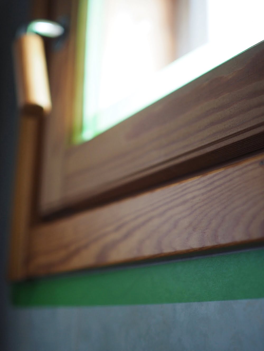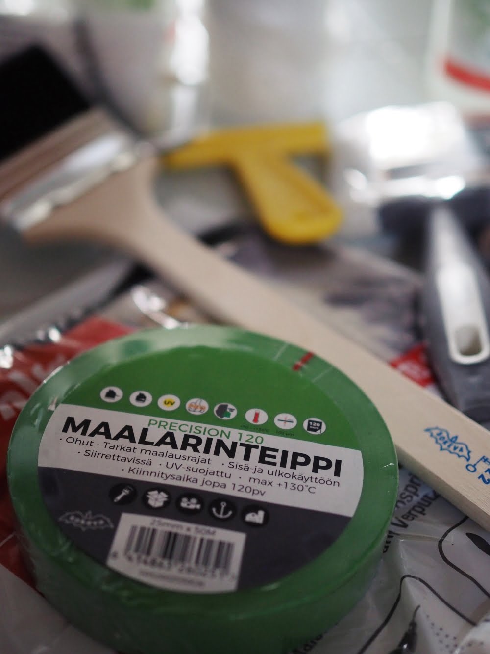 Rajaukseen käytin vihreää *Precision-maalarinteippiä, josta tuli tämän kokemuksen perusteella lemppari maalarinteippini. Sillä sai hienot, terävät maalausrajat ja se irtosi helposti jättämättä liimajälkiä. Pystyin käyttämään samoja teipinpätkiä myös karmien rajaamiseen.
