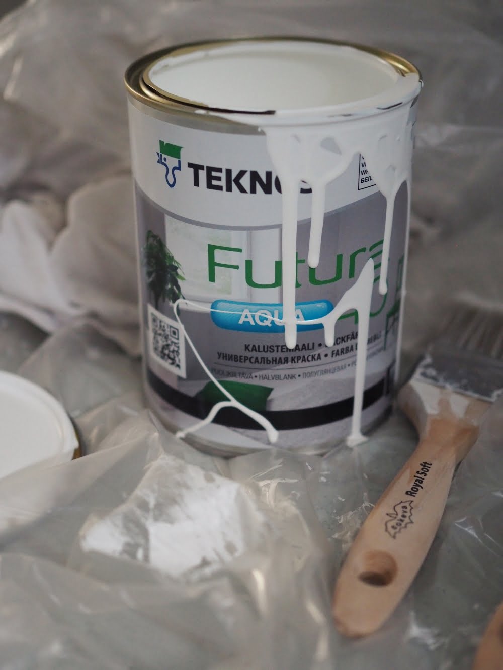 Lattiasta suojasin vain osan, kun totesin, ettei kylpyhuoneen kattomaali roisku eikä valu. Muutamat pudonneet pisarat oli helppo pyyhkäistä tuoreena pois. Maalikauppaan ei tarvinnut lähteä, sillä Teknoksen paneelikattomaalia oli jäänyt jäljelle reilusti pikkuvessan katon maalauksesta.