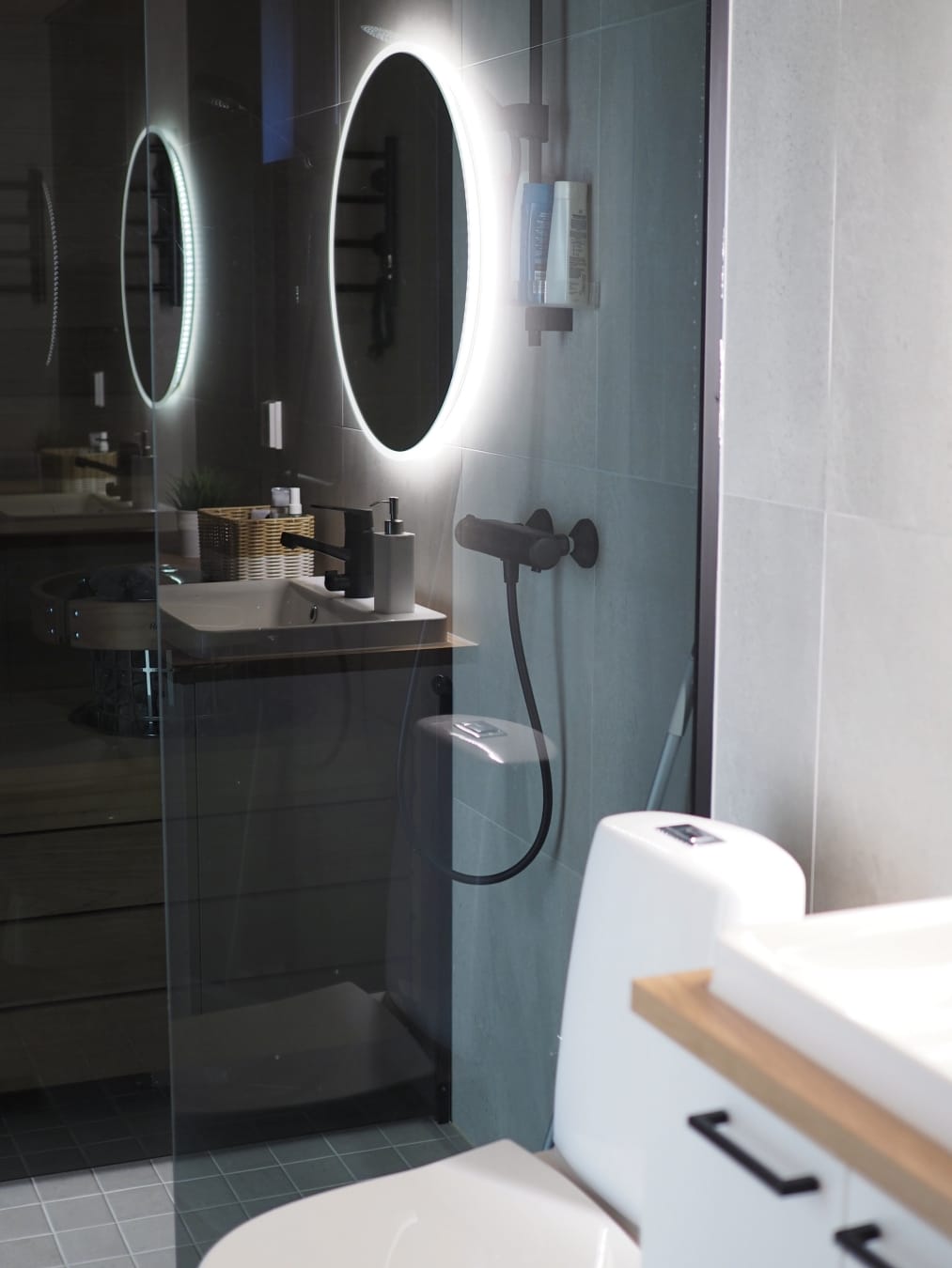 - Ajattele valaistusta kokonaisuutena. Hyvä kylpyhuoneen valo syntyy kerroksellisuudesta: yleisvalosta, kohdevaloista ja peilin valosta.