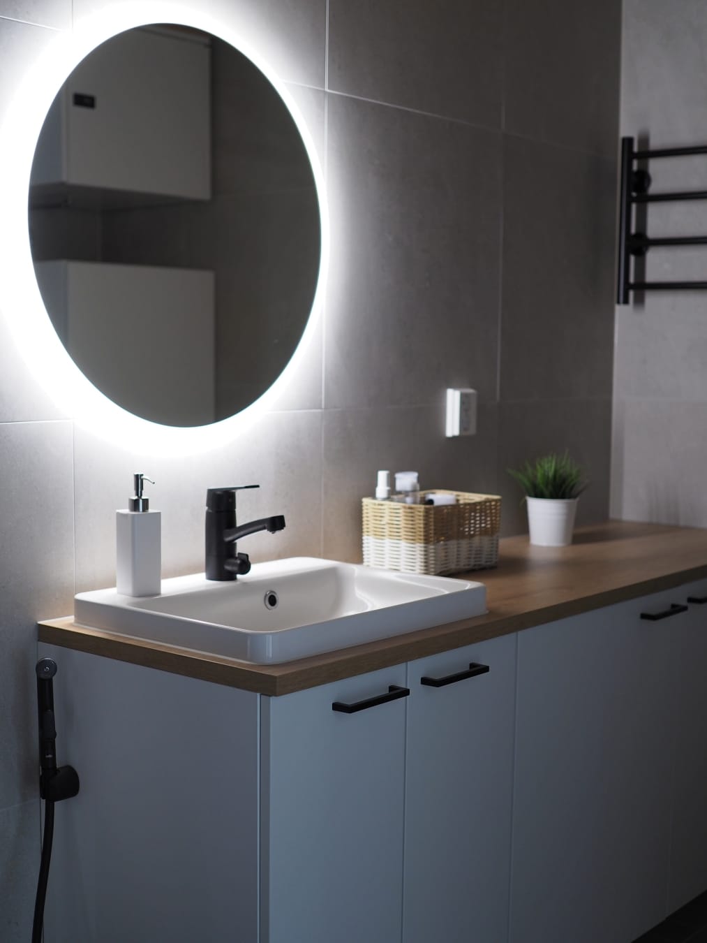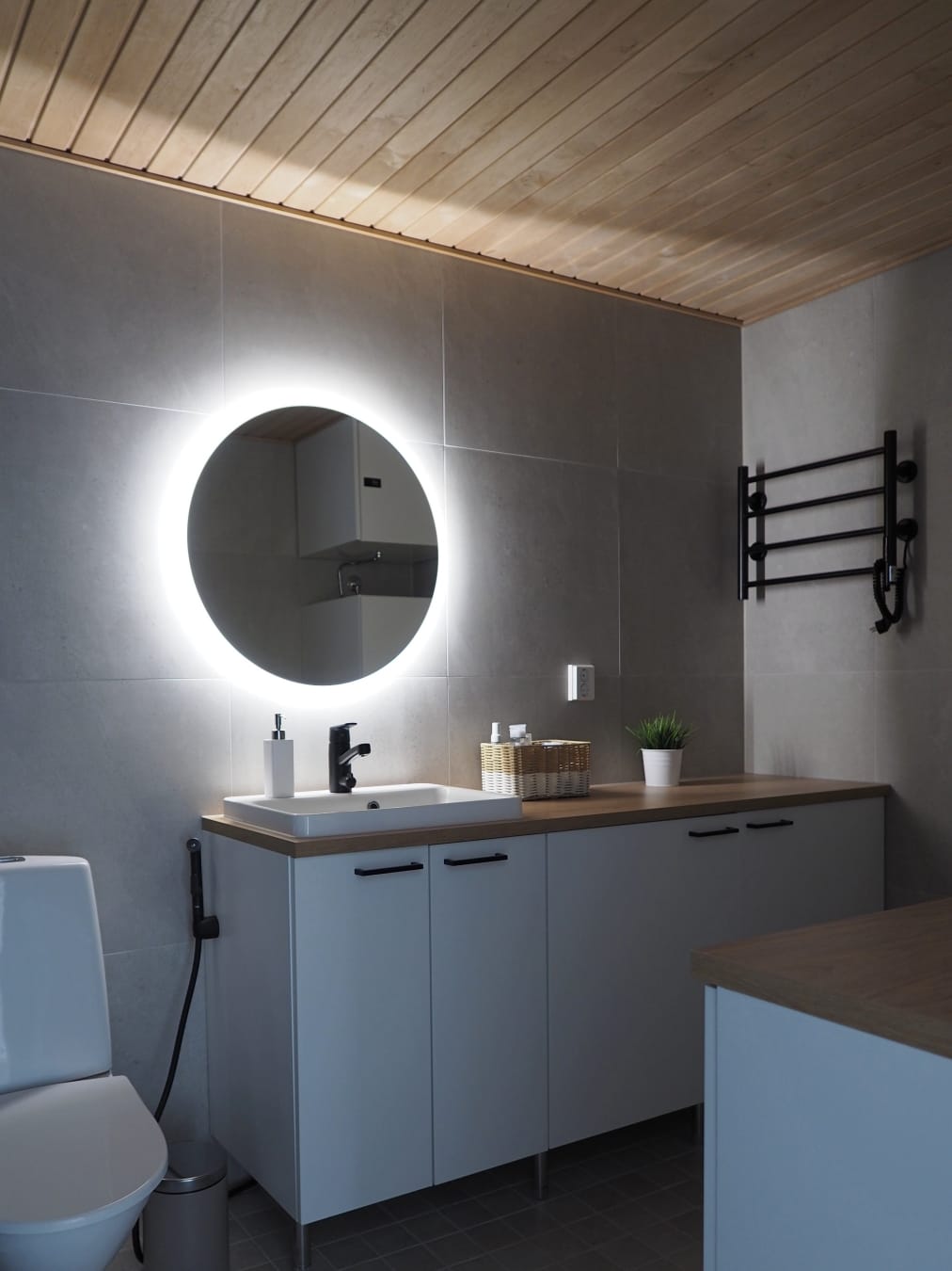 Valopeili on viime vuosien kylpyhuonetrendi, ja syystä. Se tuo tilaan kylpylämäistä tai hotellimaista tunnelmaa ja keveyttä. Pyöreä peili voi pehmentää tilaa ja suorakulmainen malli tuoda sinne modernia ilmettä. Itse tykkään todella paljon isohkosta, pyöreästä valopeilistämme. Se on ihanan ilmava ja valo on kauniin tunnelmallinen.