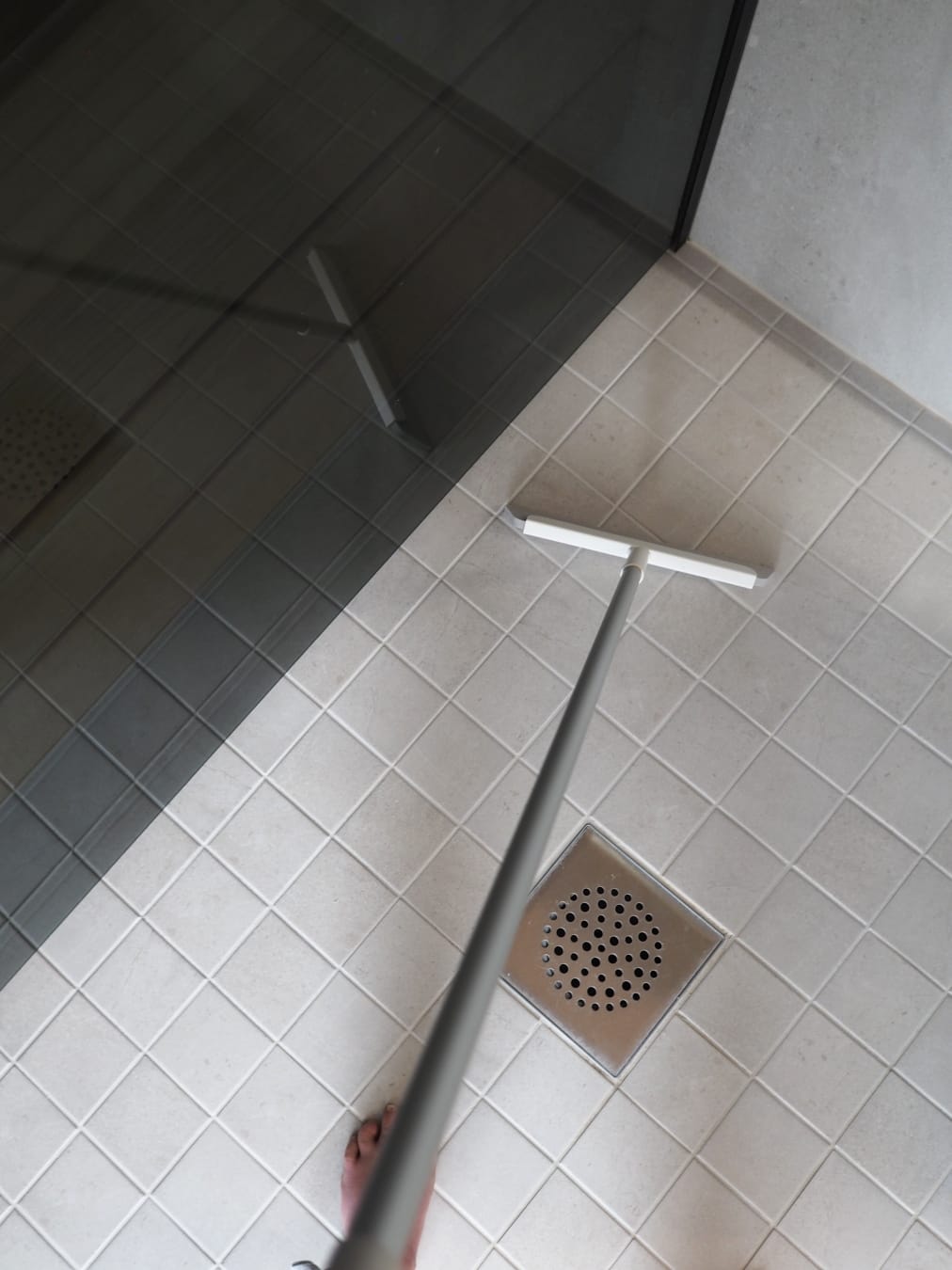 Kuivaimen pitää olla näkyvillä ja helposti saatavilla, muuten sitä ei tule käytettyä. Ikkunakuivaimen lisäksi meillä on lattiakuivain, jolla vetäisemme ylimääräiset vedet lattiakaakeleista lattiakaivoon ja seinäkaakelit kuivemmiksi. Kuivaaminen vähentää kalkkisaostumien kertymistä laattoihin sekä pintojen ja rakenteiden altistumista kosteudelle. Seinät ja lattia on helppo kuivata samalla vaivalla, kun on vauhtiin päässyt.