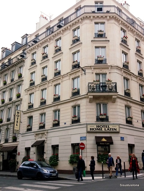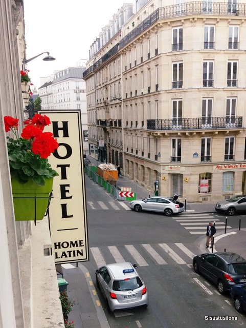 Olimme varanneet huoneen pienestä, viehättävästä Collegede France -hotellista, joka sijaitsee hyvällä paikalla Latinalaiskorttelissa, yliopistokaupunginosassa. Huone oli ylimmässä kerroksessa ja suloinen, mutta todella pieni. Lisäksi ohuen seinän takana oli hissin konehuone, joka piti hirveää meteliä aina, kun hissi vähänkin liikahti. Ilmoitimme respaan, ettemme pysty nukkumaan huoneessa. Hotelli oli täyteen buukattu, mutta respa lupasi hoitaa asian. ”Give me twenty minutes”, hän pyysi.