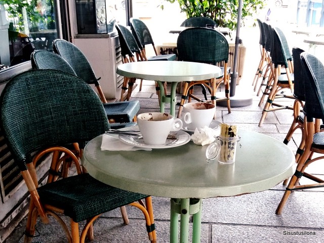 Monen mielestä jo pelkkä kahvilakulttuuri riittää syyksi matkustaa Pariisiin. Kahvilat eivät ole pelkästään paikkoja, joissa hörppätään hopeasti kahvit, vaan ne ovat kohtaamispaikkoja, olohuoneita ja ylipäätään paikkoja kaupunkielämän keskiössä. Ja kahviloita Pariisissa todella riittää, joka makuun ja jokaiselle kukkarolle. Useimmissa kahviloissa näytti olevan pöytiintarjoilu, mutta laskun voi käydä maksamassa myös tiskillä.