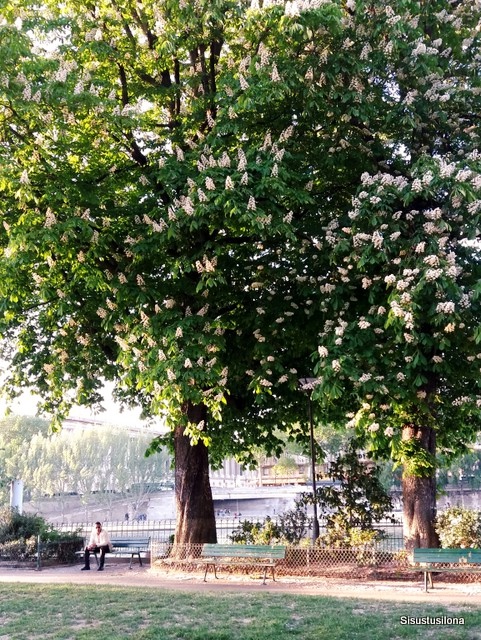 Lauantai-iltana löysimme Seinen varrelta kauniin auringonlaskupuiston, jonne laskeva aurinko paistoi upeasti. Nuoret kokoontuivat Seinen penkereille eväineen ja myös puistossa oli ihmisiä piknik-koreineen nauttimassa illasta.