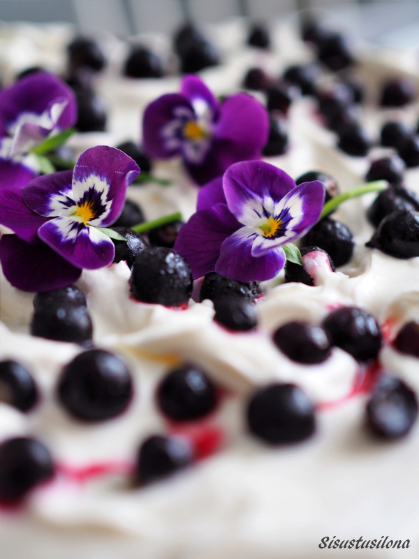 Sihtasin marjojen päälle vielä ripauksen tomusokeria ja kipaisin hakemassa ulkoa muutaman orvokin koristeeksi.