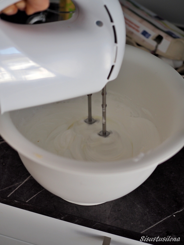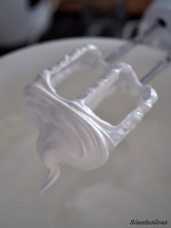 Vatkaa valkuaiset puhtaassa ja kuivassa kulhossa kovaksi vaahdoksi. Keltuaista ei saa olla mukana yhtään. Sekoita vaniljasokeri ja maissijauhot sokeriin ja lisää seos valkuaisvaahtoon vähän kerrallaan ja jatka vatkaamista. Sekoita joukkoon vielä etikka.