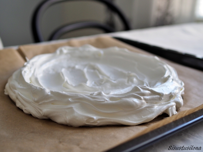Aseta leivinpaperi uunipellille ja piirrä siihen lautasen tai kulhon avulla ympyrä, jonka halkaisija on noin 24-26 senttiä. Levitä marenkiseos ympyrän sisään niin, että reunat ovat vähän keskustaa korkeammalla.