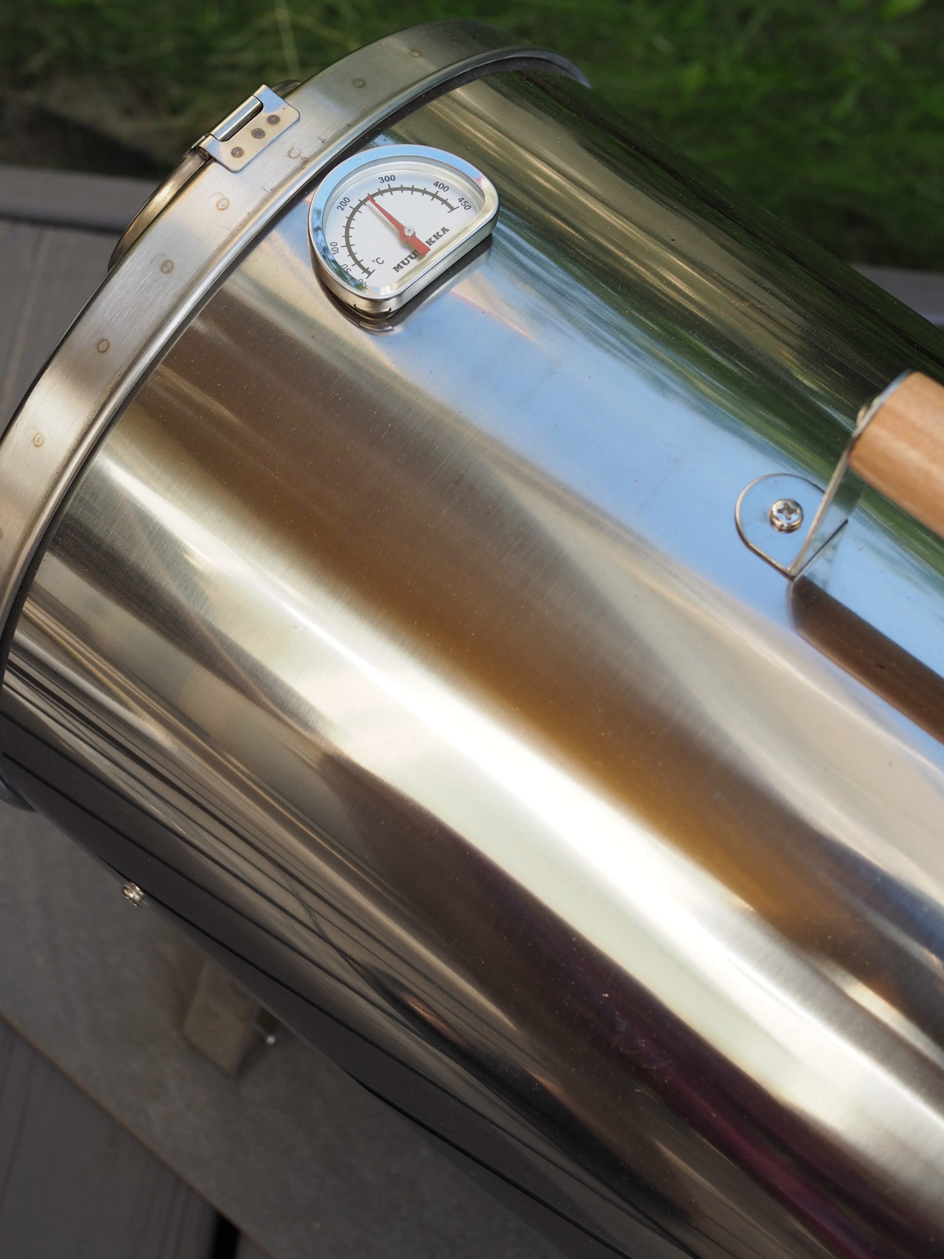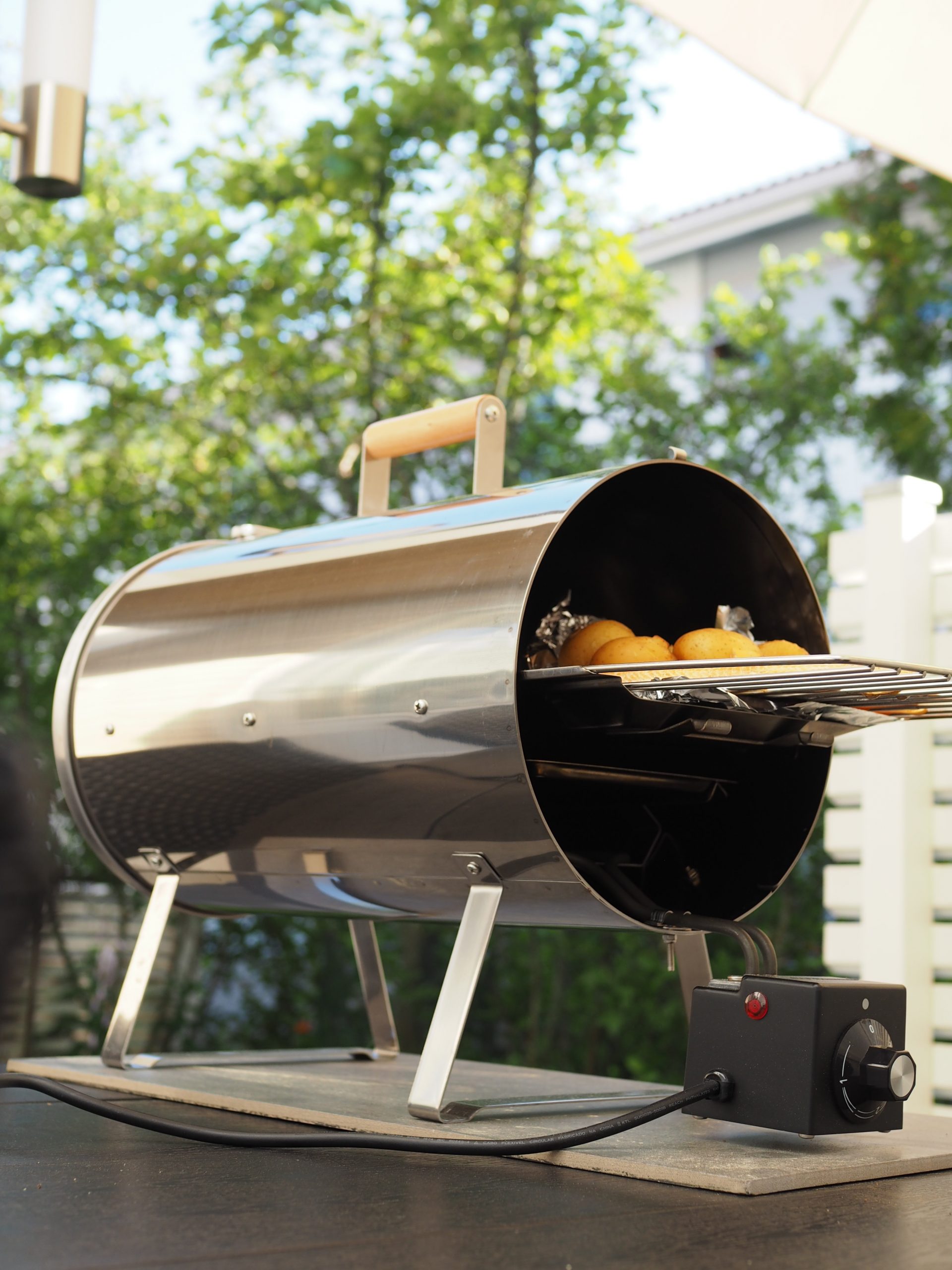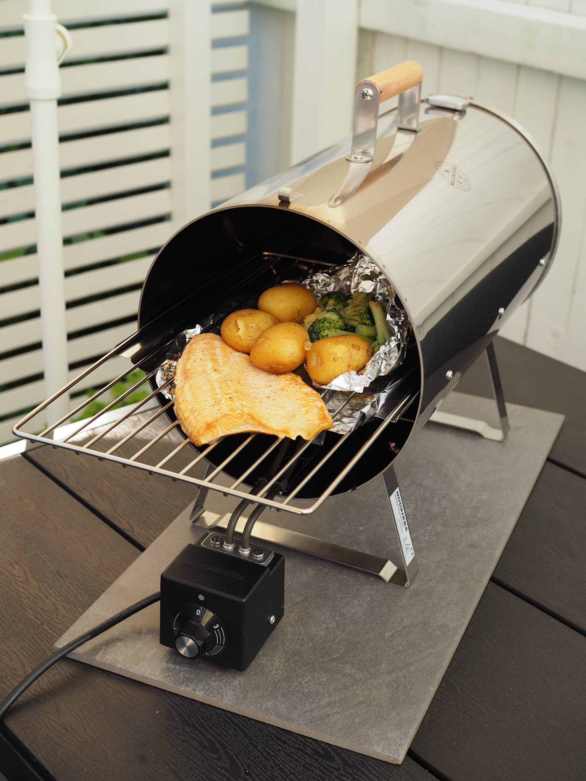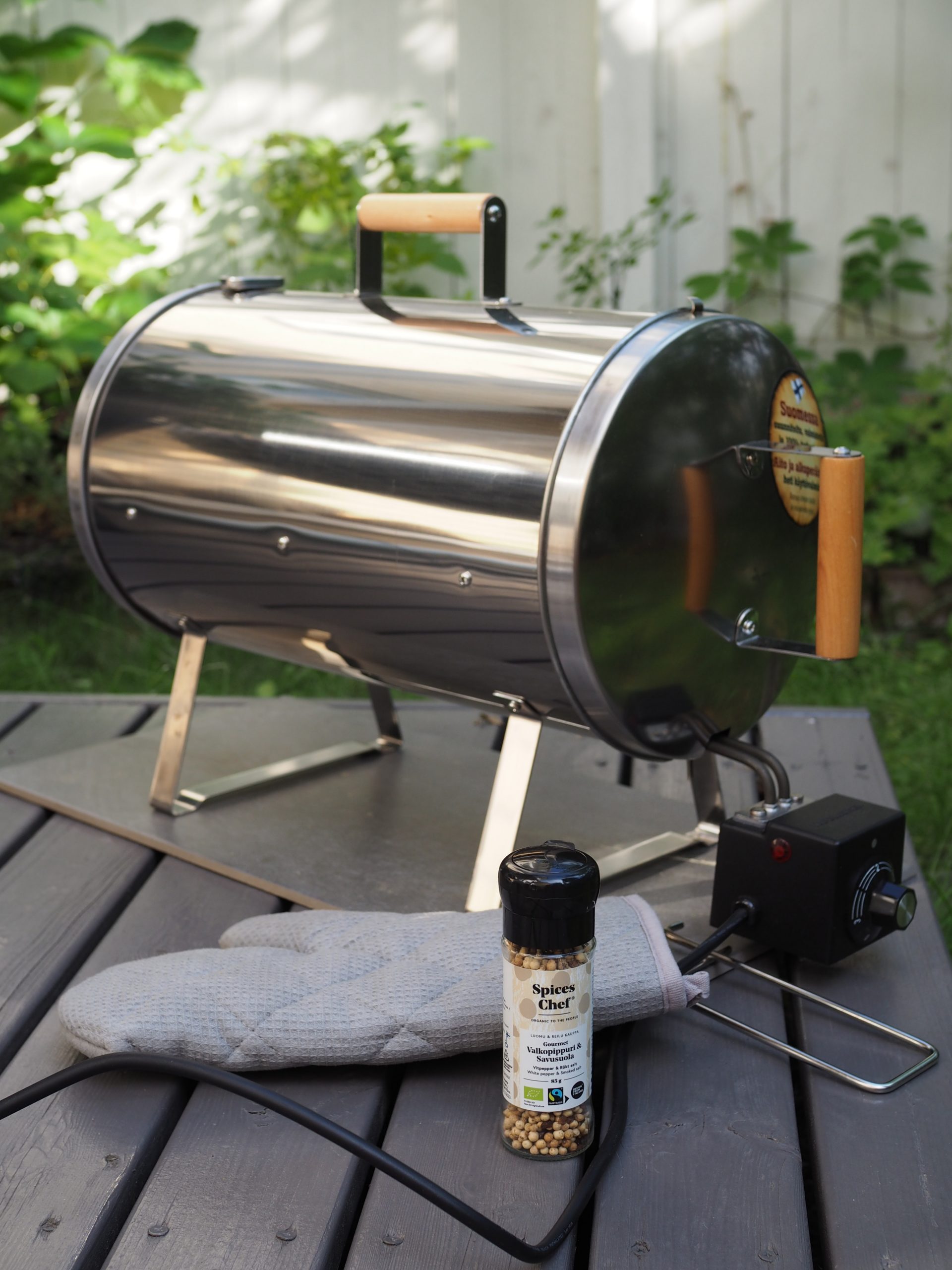 Sain yhteistyön tiimoilta Muurikan PRO 1100 W sähkösavustimen, jonka runkoon on kiinnitetty lämpömittari. Siitä on helppo säätää ja seurata savustuslämpötilaa. Savustimessa on kolme eri tehoa ja lämpöä voi säätää portaattomasti 75 asteesta 230 asteeseen.